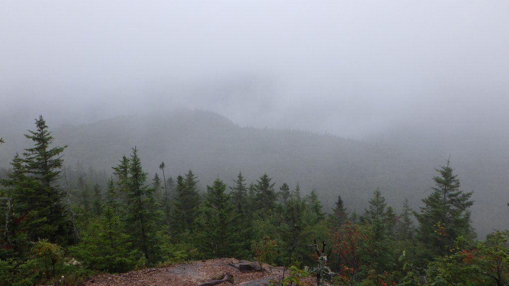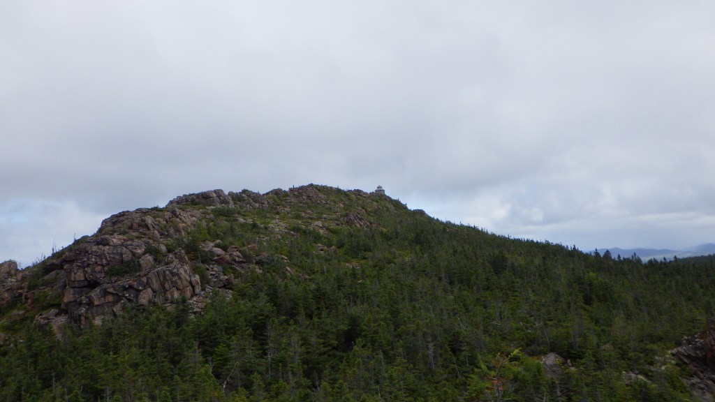 After soldiering on for a few kilometres (passing the turnoff for the Mount Head summit which i hit two days later) I finally saw the last stretch to the summit of Carleton. With renewed vigour, ignoring the discomfort from the wet and cold, I pushed onwards over the steeper, rockier trail until I finally reached the old fire cabin and the highest point in the Maritimes! One major change as I emerged from the woods was the wicked wind that was blowing which dropped the temperature significantly. In addition it was very foggy so I couldn’t see much in terms of a view.