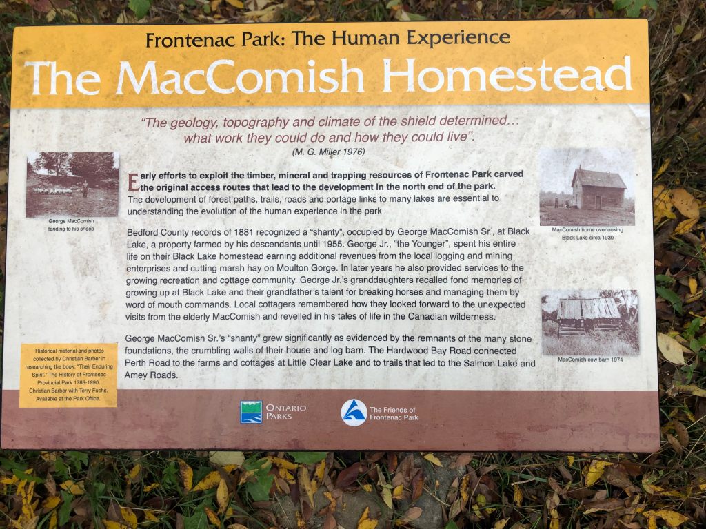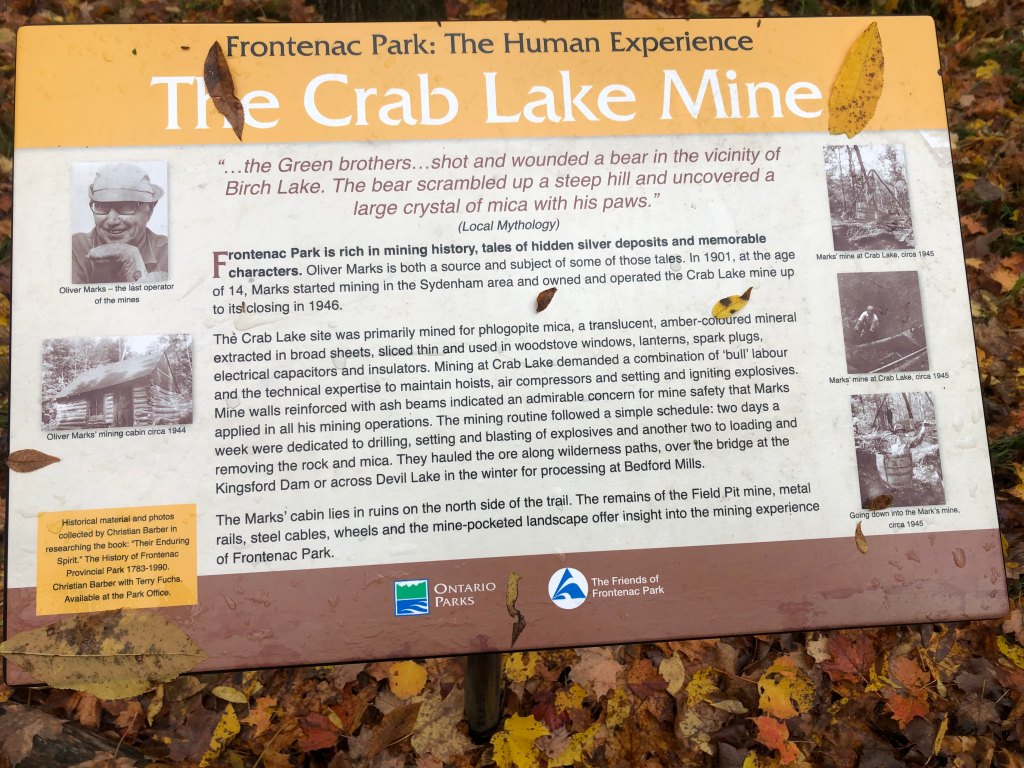 I planned on Day 1 to hike roughly 23km to my site, going counter-clockwise effectively around the outer perimeter of the park. I missed my turn and decided to do my planned Day 2 hike (~21km) in reverse on Saturday, followed by my planned Day 1 hike also in reverse on Sunday. Thus, on Day 1, I made my way north and east along the Arkon, Tetsmine, and Gibson Lake loops. My plan regarding breaks was to take a 10 min or so break every 5km. The trail was fairly easy to hike, so I was able to make good pace. The autumn colors were incredible, I love the wide range of yellow, red and orange, and the fallen leaves looked gorgeous in places. I did have to be a bit extra careful watching my step though, since the leaves obscured hazards like roots and rocks a bit more. There was also quite a few neat historical plaques that had been set up, pointing out some of the history of the area. This included The Page Homestead and The Crab Lake Mine.
