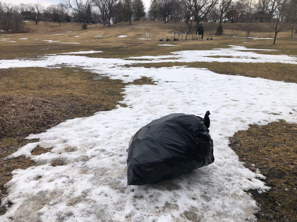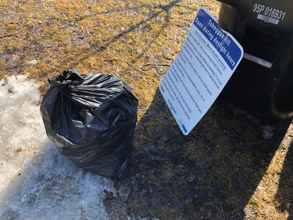 So far, I’ve found quite an assortment of items, including but not limited to a towel, a bra, a pair of jeans, copious amounts of plastic from sleds (it’s insane how much of this there is!), a pair of toddler mittens, a pair of panties, bags with dog poop (this one is very confusing), a dead (rotting and putrid) squirrel in a bag, a boomerang, a bicycle frame, and around a hundred (yes 100) face masks. Quite the vile, yet eclectic collection!