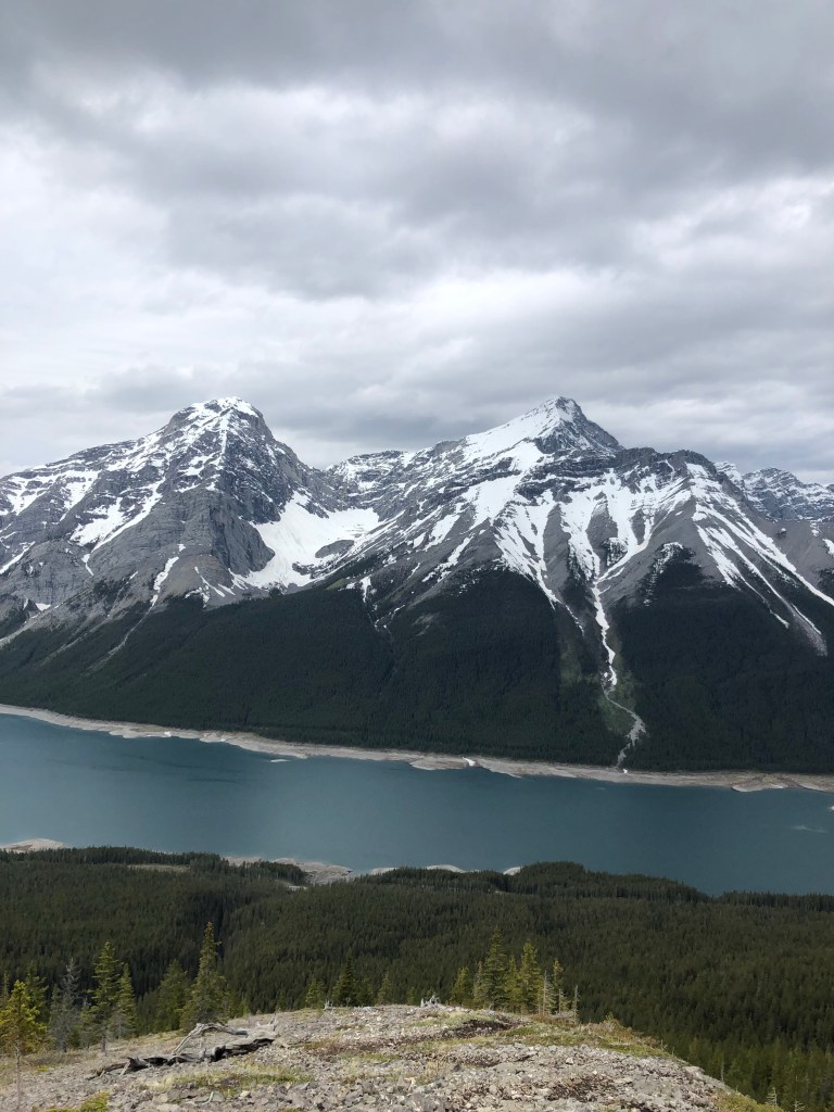 For the descent, I put on my waterproof gear along with my microspikes to help with grip and traction on the way down. The descent was actually pretty fun – I tried to stay in the snow as much as possible, and actually followed an old set of footprints for a while, but didn’t have to worry too much about slipping on the scree. I did land on my butt a few times but snow is pretty cushioning so no issues. At some point on the descent my Gatorade water bottle (which I had bought the day before!) fell out of my pack and I only realized when I got back to the car. As a result I have lost Gatorade water bottles in two Canadian provinces – New Brunswick and now Alberta. Hopefully the streak ends there. 😦 Thankfully I didn’t lose my bear spray (which was in the same pocket as the bottle)!