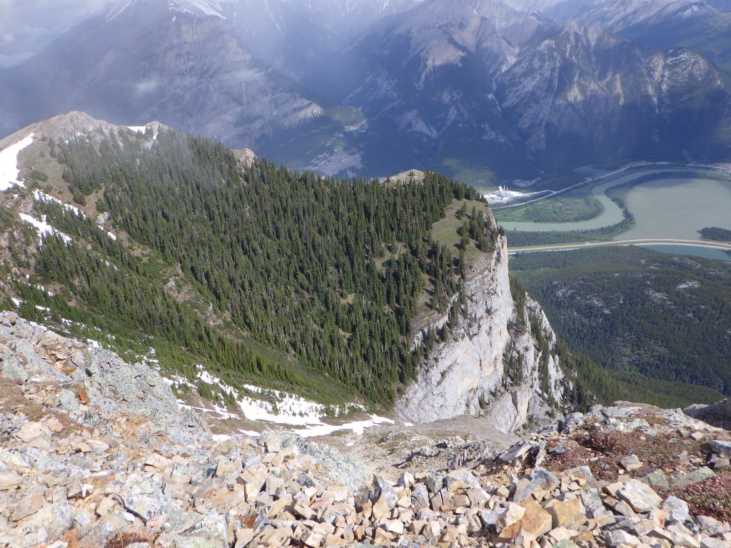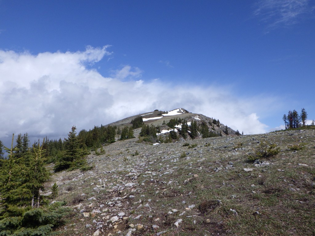 Wow, the trail got tough quickly. After a short forest section, the trail emerged onto a grassy hill that stretched as far as the eye could see. It was very steep, but that wasn’t a problem, since I was now above the treeline, so I could see (and often stop to take photos of) a ton of peaks in the background, including the Three Sisters! This trail reminded me strongly of the Karaula/Mali Polich hike I did in Bulgaria, just over 3 years prior. During the climb I saw a lot of rodents (likely Hoary Marmots) running around (and hiding in their burrows when they heard me coming). Unfortunately I did not see any Bighorn Sheep – this trail is closed for a large part of the year so they aren’t disturbed during breeding season. There were also several snow patches to traverse, but it was nowhere near as much as on Read’s Tower.