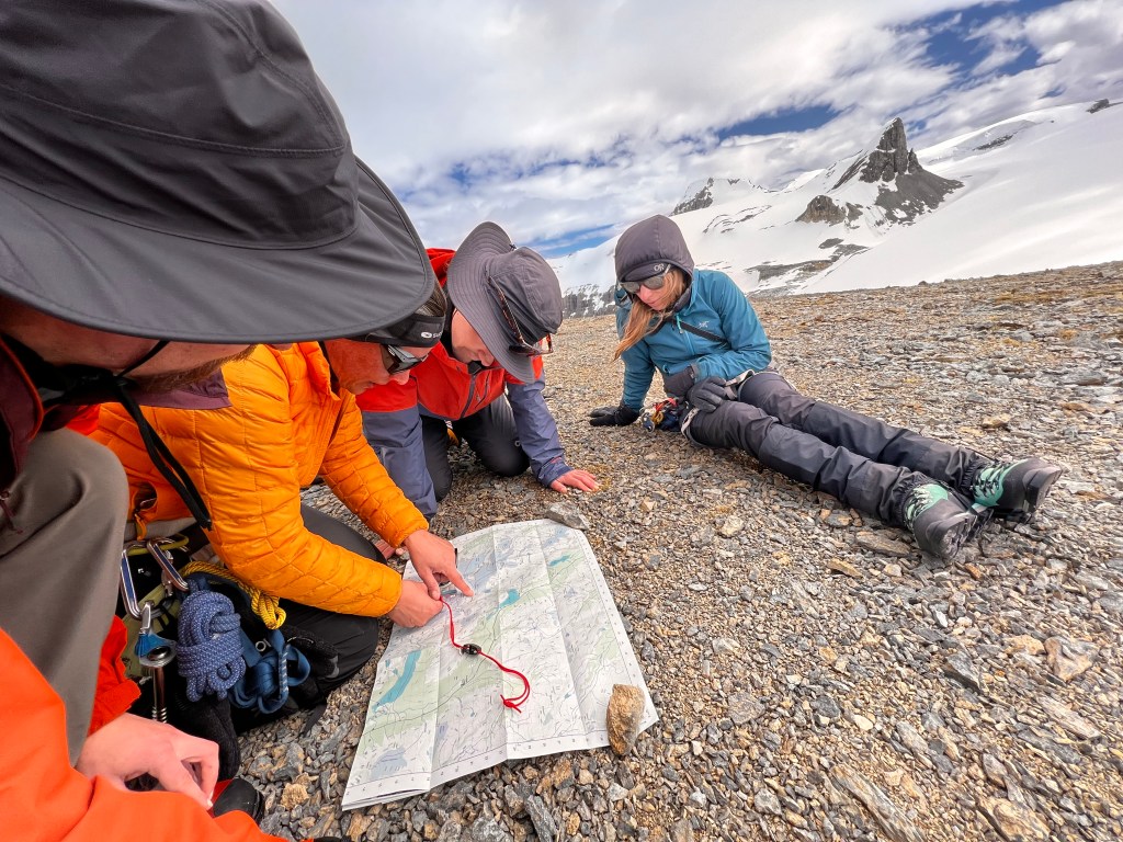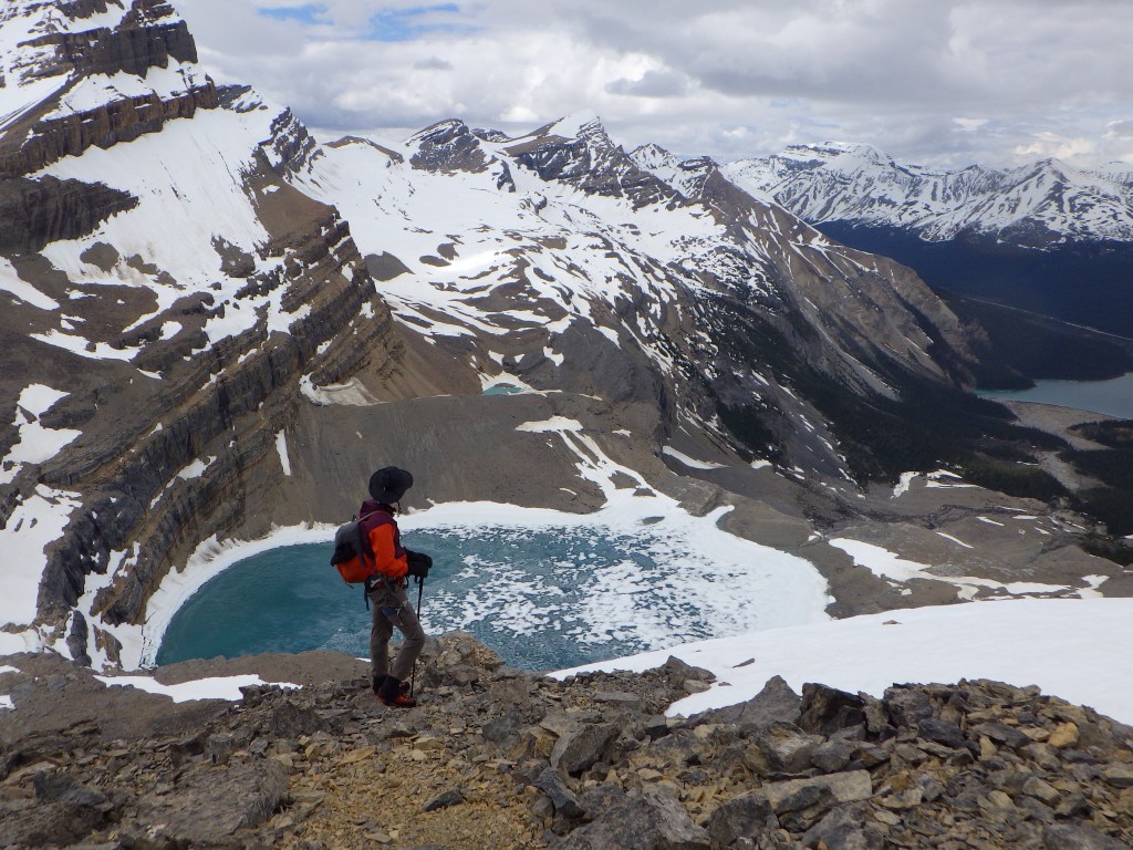 We got to the top of the Onion and enjoyed the view. We also started looking at map and compass usage in order to identify some of the neighboring peaks like St. Nicholas, Habel, Ayesha, Thompson, Gordon, and Rhondda, (interestingly, we learned later on of a couple who got married up on the Wapta Glacier, and their names were Rhonda and Gordon!), and got some photos in front of Portal Peak and the glacial lake at its base. Our plan for the next day was to try for Mount Rhondda and learn a bit about executing crevasse rescues. After returning to the Hut we enjoyed a delicious dinner and it was off to bed.