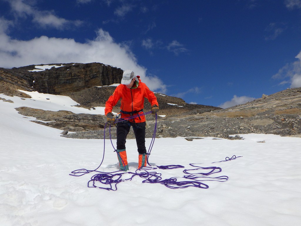 After a short hike (Richard stressed the importance of taking it slow to start at higher elevations since the air is thinner), we got to the glacier and it was time to rope up. No crampons for this excursion, as it was pretty soft out on the glacier. We split off into two teams of three, each team on one rope. The way it works for a team of three is still 10m between each climber, with an excess ~10m of rope carried by the terminus climbers (helpful in case crevasse rescue is needed). The teams were myself with Luca and Andrew, with Richard joining Karly and Janet.