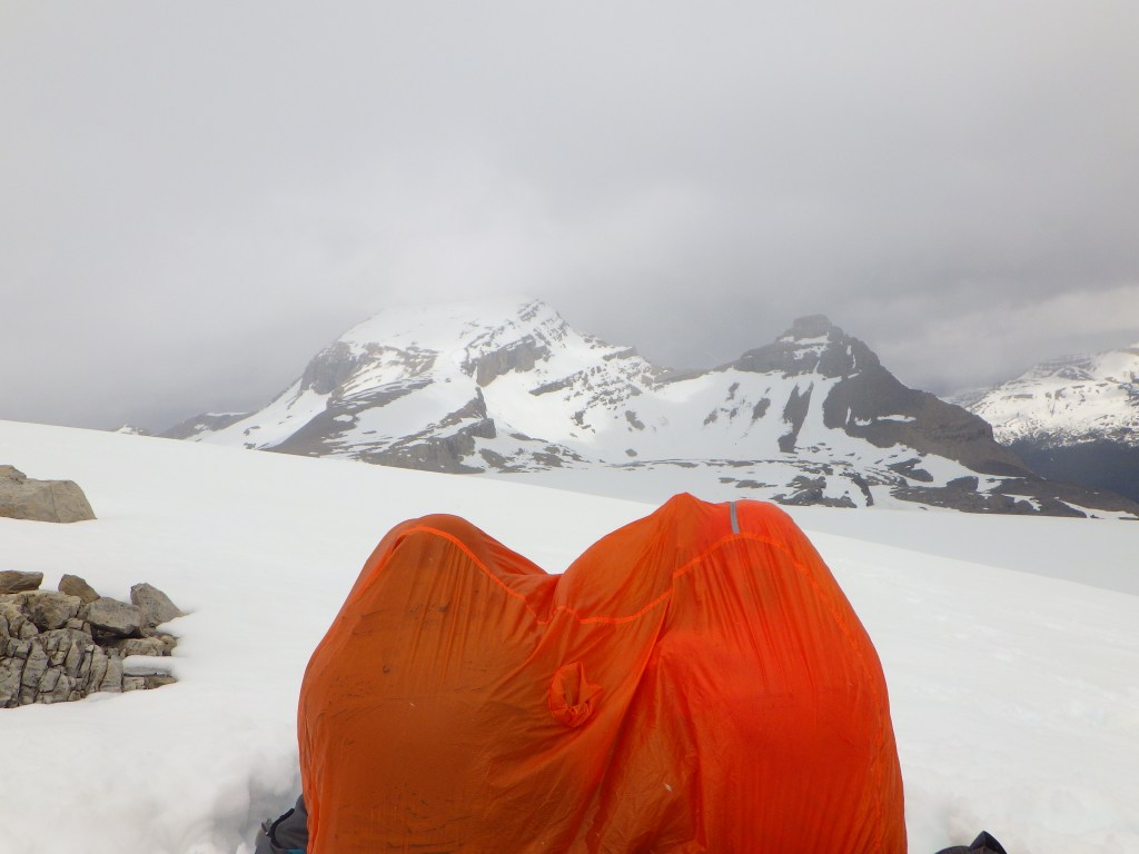 We spent quite a bit of time getting set up on ropes, and then we were off. We took occasional breaks as we worked our way up, with rainfall starting at around 11am off and on. The rain turned to snow and we hunkered down in Richard’s emergency shelters to eat our lunches. It was a huge contrast between the cold windy snowy conditions outside to the warmth inside the shelter. After lunch, we continued onwards but it became apparent that the conditions were not cooperating. At around 1:30pm, Richard made the call to abort our summit attempt and we turned around. While it was disappointing, it was definitely the correct decision.