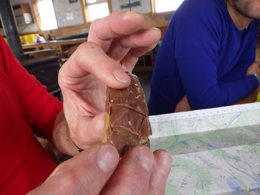 Richard also described how glaciers move and the effects on crevasse formation. A glacier is pretty much a very slow-moving river, and crevasses form when the glacier flows over bumps in topography. He demonstrated how this works using a simple Mars bar!