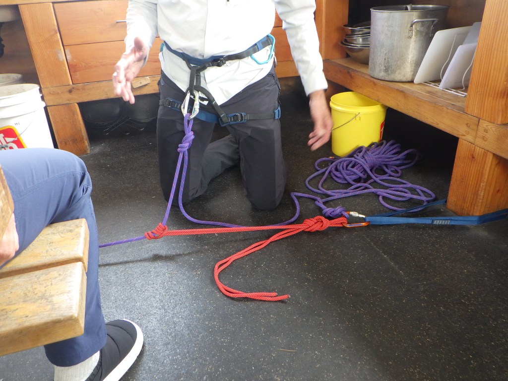 We spent a lot of time working on crevasse rescue techniques both in the hut as well as outside the hut (obviously, not a great idea to purposely fall into a crevasse!). The main points are that you want to keep a minimal amount of slack in the rope to ensure the fallen climber doesn’t fall far, and communicate with the fallen climber in order to gauge how far they’ve fallen, any injuries they may have sustained, and whether they are able to climb out on their own. Typically the first climber on the rope is the one who falls in, so the second climber creates an anchor to take on the load of the fallen climber, allowing the remaining climber (assuming a 3 person team) to make their way forward with rescue rope to assist the fallen climber. It’s obviously a lot more complex than this, but I don’t really want to inundate readers with too many details. Definitely a very technical method! We also learned how to tie various knots like prussik knots, and also how to bundle up the prussik ropes which are typically carried on the harness via caribiners.