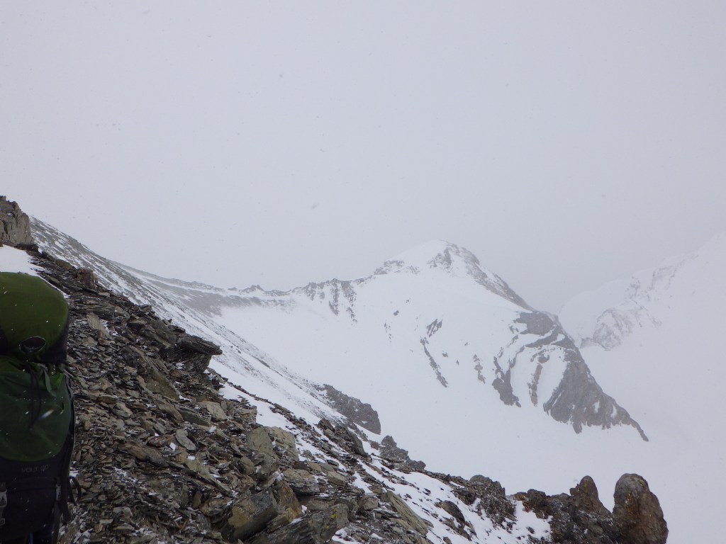 Finally, at around 10:30am, we arrived at the north summit of Mount Olive, situated at 3103m. The south summit, which is slightly higher at 3126m, was only about 500m away as the crow flies, but Richard decided that due to the failing weather, we would save that for another day. We stayed for about 10 mins at the summit, taking photos (views were non-existent at this point). Not quite an elevation PB for me (South Sister in Oregon was higher at 3157m) but it was the highest I had been in Canada to date, so that was something. Also, congrats to Luca for visiting BC on this climb (the rest of us had already been there) as we crossed over the border traversing around Mount St. Nicholas. The south summit of Olive actually sits entirely within BC.