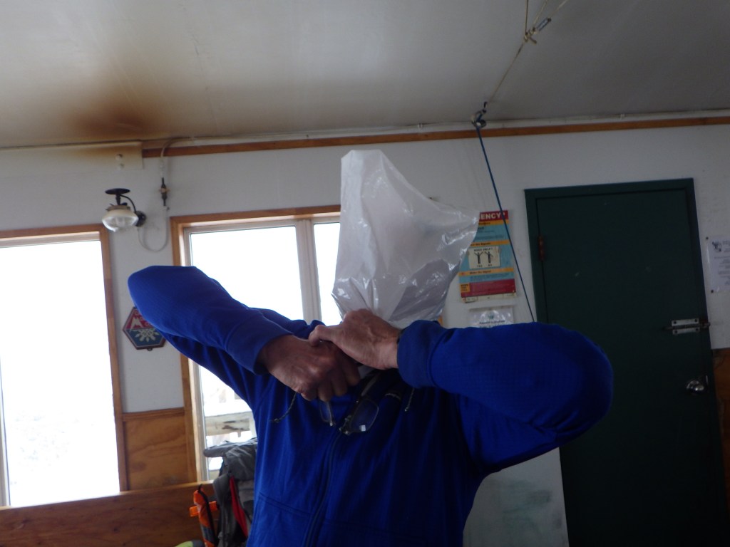 We did some final practice of crevasse rescue in the hut, and Richard demonstrated how to use pulleys to created sit-stand setup to hoist oneself out of a crevasse. We packed out our garbage from the trip to dispose of in the bins at Bow Lake. I took a large amount of the garbage as I had a lot of space in my pack. I double-bagged because I was worried about leaks, and Richard chose an unconventional method to determine there were no holes in the bag to ease my mind.