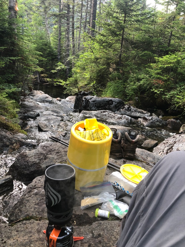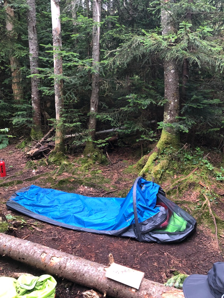 I eventually made it to Upper Works trailhead and although the parking lot was near full, I was able to find parking without too much difficulty. After getting my stuff together, I hit the trail at 2:30pm. The hike was pretty uneventful, not too difficult until I reached Colden Lake. I noticed that all the campsites were occupied, so I planned to hike until I found something. Well, I got to my final possibility at Flowed Lands, and after talking to a couple girls (from Calgary, what are the odds), they told me that everything was taken and my best bet would be to find a spot not designated for camping. I set up my stove by the river to cook – had pasta, dehydrated veggies and some beans (I forgot to buy lentils but luckily had some leftover rehydrated beans from home which I quickly ate to avoid spoiling). After washing up and brushing my teeth, I set off again up the trail and found a tiny little bit of ground (2m x 0.6m or so) to set up my bivy. I love how little space is needed for this thing!