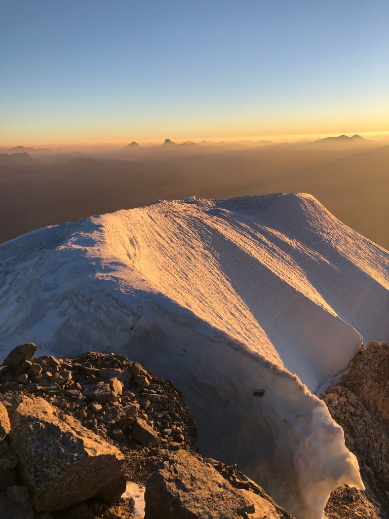As we approached the final summit ridge, the sun was just starting to peek out over the horizon, making for some spectacular sunrise views of the summit ahead, along with the surrounding peaks. Despite the soreness in my legs and feet and breathing heavily, I had the biggest grin (/grimace?) on my face as I knew the summit was just ahead, and forged onwards, and was finally at the summit just before 7:30am after 4 hours and 25 mins of hiking. It was the highest point I have ever stood at 3544m above sea level. Andrew was just ahead and we were absolutely stoked to have made it to the top. We immediately started taking photos and congratulating the rest of our party as they made their way up to join us. Summitting at sunrise was truly the most exhilarating experience of my life – what a beautiful view!