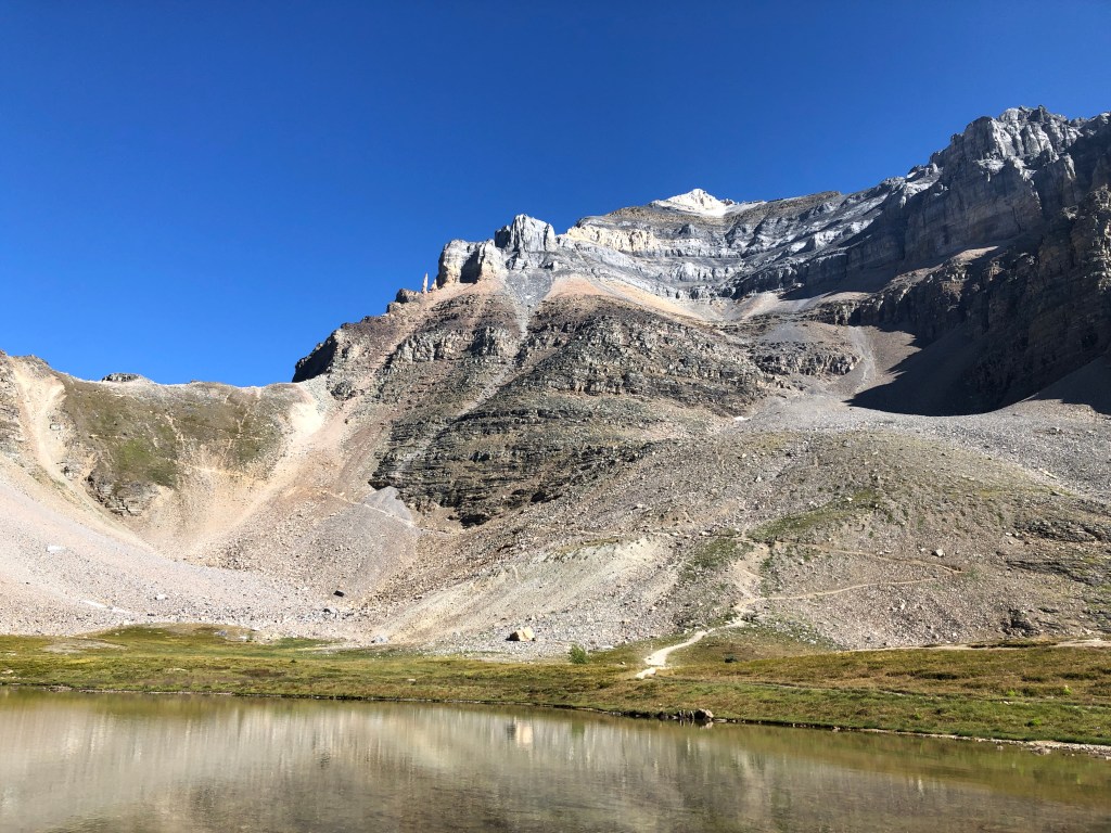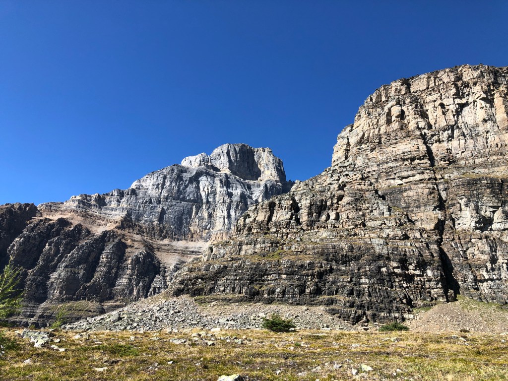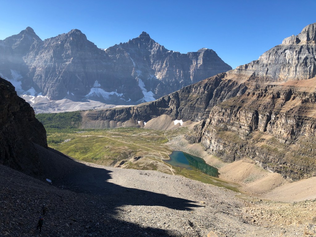 It was quite cold at the top (even with a base layer, hiking shirt, soft shell, fleece and hard shell on, I was still quite chilly), so I was glad to begin the descent after about 90 mins at the summit. The descent was very slow and deliberate as I did not have trekking poles (could not bring as carry-on) and the terrain was quite loose. Karly lent me one of her poles after a little while, and it was absolutely a godsend, it helped a lot in keeping my balance. It was at this point that it actually became quite warm on the slopes, and I gradually removed layers. Also, we somehow lost the trail right at the first grey rock band, and several of us, including Karly, Luca, and a couple other guys we were climbing with, took a wrong turn and descended a precarious scree slope (which took over an hour). This area is noted by Parks Canada to avoid due to rockfall hazards – I was careful to not follow the people ahead of me too closely for that reason. Super tough section and very fortunate no one got injured.