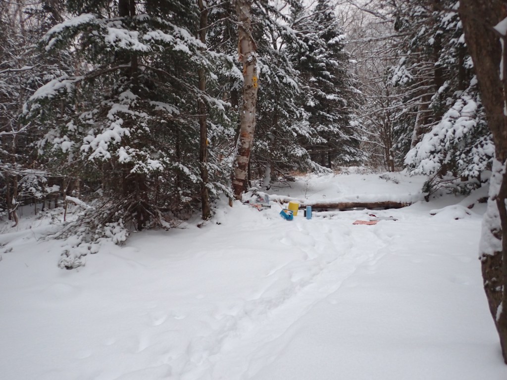 I drove up from my place to Nikola’s parents’ house to pick up Nik and Harmony, arriving at about 6:20am. We packed (aka tetris’d) my tiny hatchback and were on the road by 6:40am. Nik and Harmony had really warm -19C bags and Nik wanted to not compress them into the packs for the drive, so they were carried on laps in the large storage bags. Nice pillow for a long drive at least! The entire backseat (save one small spot for Harmony) and trunk were fully stuffed with gear as well – I have never put so many things in my car before. We made a couple stops along the way for bio breaks/coffee/gas, making sure to take advantage of those sweet sweet USA fuel prices. We arrived at the Adirondack Loj at about 12:45pm, a bit later than planned, and after getting our packs loaded, we set off on the trail at about 1:45pm. Was a pretty fun hike in near winter conditions. About an hour into the hike we realized it would be impossible to safely reach Lake Colden in a reasonable time, but there was a really solid backup site near Avalanche Camp lean-to that had access to a trail to Mount Colden as well as a running water supply.
