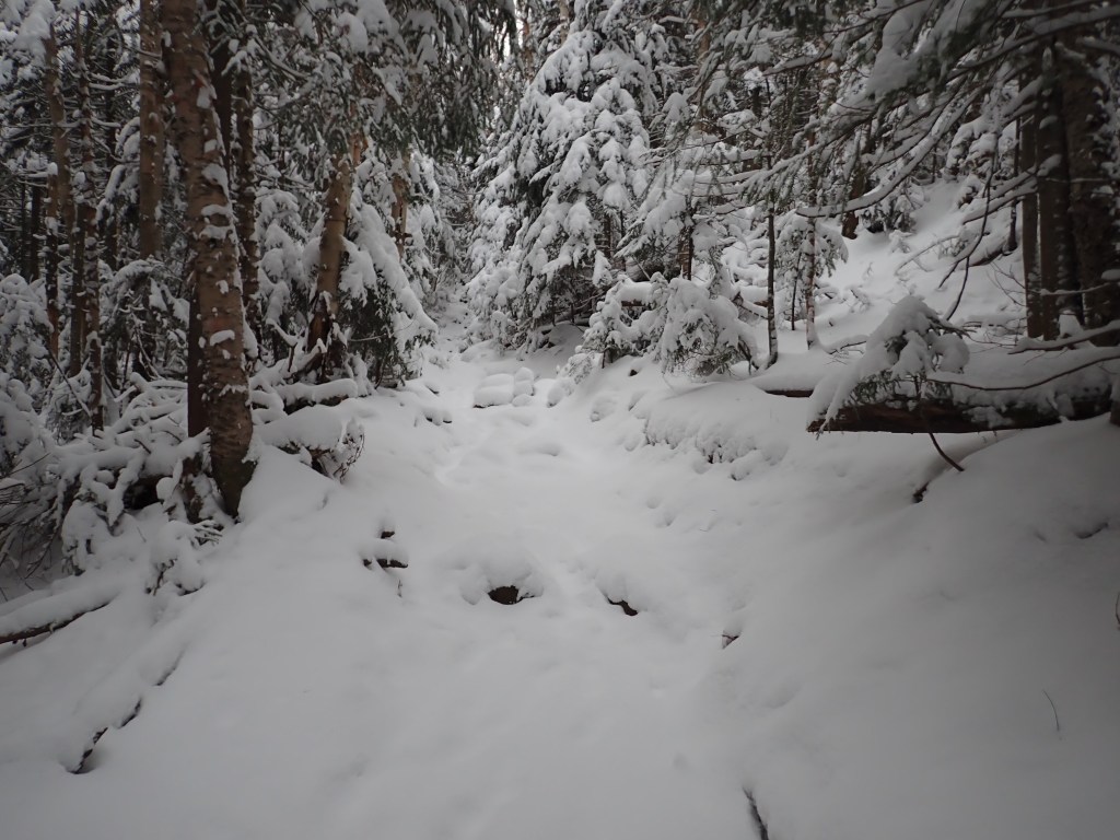 Our impromptu choice of campsite was actually pretty good location-wise. There was a trail just 50m away (Lake Arnold trail) which lead up to the summit of Mount Colden, so my plan was to ascend via this trail and come down the steeper Mount Colden trail, which would have put me at Lake Colden, with easy access to Mount Marshall. The trail was covered in a decent (roughly 3-4 inches) amount of snow so it was slower going trying to avoid any uneven steps. I made fairly decent time up to the junction at Lake Arnold, however it was here I determined that I would likely not have enough time to climb Marshall, so I would just do Colden.