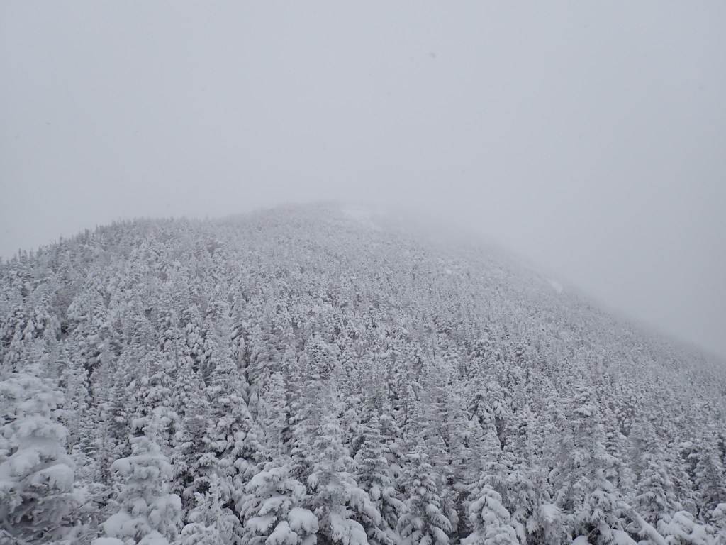 The snow became deeper as I ascended, as well as a bit steeper and icier, but I managed without my microspikes for a while. Eventually, I reached a bare (“false” summit?) lookout area where I decided to don the spikes, which remained on for the rest of the day. I did not have snowshoes (likely not enough snow pack given the amount of rocks to navigate, but probably would have been smart to carry regardless) and also (foolishly) did not put on my gaiters. As a result enough snow got into my boots for my feet to get wet. They weren’t cold though, so I made sure to keep moving as much as possible and only stop for short stretches to adjust layers or grab a bite. At the false summit it was very snowy and windy, with almost zero visibility.