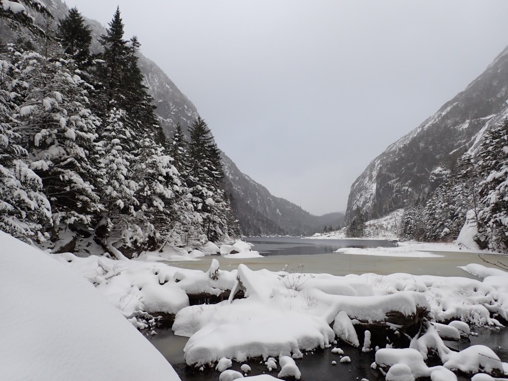 I carefully navigated the trail (I had mildly hyperextended my knee on the summit) and encountered quite a few other hikers on the trail. The first group of three guys had come in from the Loj and were looking to do the same trail as me but in the opposite direction. They didn’t have spikes so I warned them of the ice issues and wished them luck. Hopefully they didn’t get stuck! I also ran into two large groups (one from Ottawa, one from the GTA) so it was nice to see a bunch of compatriots on the trail. Once I arrived at Avalanche Lake the views were absolutely gorgeous. The trail was a bit dicey with a lot of icy rocks, but I took my time and eventually made it back to easier terrain.