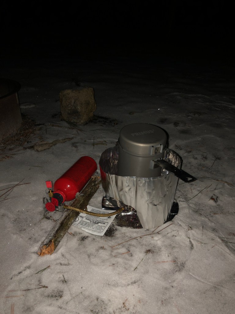I left Toronto at around 11am. I packed quite a lot for this trip – as it was going to be my first solo winter camping trip, I opted to stay at the Wilderness campground near the Adirondack Loj (car camping). This allowed me to have access to some amenities while still getting accustomed to lower temperatures. Prior to this trip I had purchased a winter sleeping bag, the MEC Talon -17C, along with a liquid fuel stove (MSR Whisperlite), so I was looking forward to using those out in the field (I made sure to practice lighting the stove beforehand – it’s a bit more involved than using gas canisters).