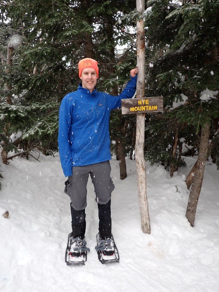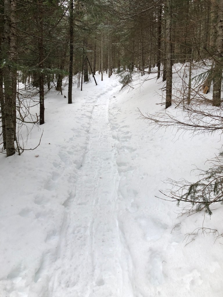 I strapped on my snowshoes, grabbed my pack and started my hike just before 12:20pm, and opted to go for Street and Nye first, as these two are a shorter hike as well as featuring less elevation gain. My goal was to finish and make camp before dark if ideal, so S&N were the logical choice. The trail was in superb shape – shoutouts to all the people who packed down the snow on the trail, creating an easy to follow trench. There is a rule in most areas of the High Peaks that you must wear snowshoes if the snow cover is 8 inches or deeper. This is to avoid what is called postholing, which is when your feet sink deep into the snow, creating a hole which can pose a safety hazard for others. Snowshoes spread your weight over a wider area, so it is significantly more difficult to posthole, and thus it is strongly frowned upon to “bareboot” or just use spikes on snow-covered trails. Not to mention it’s so much more fun to NOT sink in every step!