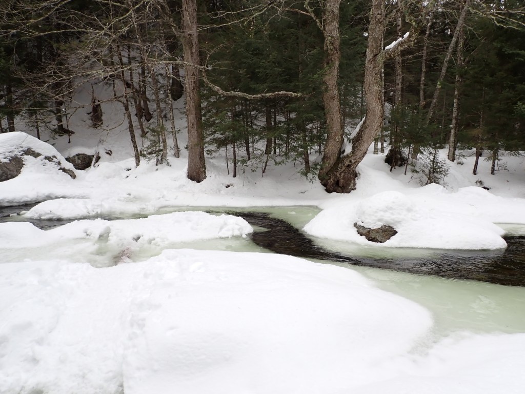 I eventually reached the infamous water crossing at Indian Pass Brook, which can make the trail virtually impassable at certain times of the year (such as springtime or after heavy rainfall). Winter can produce ice/snow bridges which make it possible to cross without getting one’s feet wet, and luckily there was a great spot just north of the main crossing area which had only a small slushy area which was solid. Not long after the water crossing, the incline started and I slowed down quite a bit. I had trucked out the first part of the trail and I really felt it here. I also foolishly did not employ the heel risers on my snowshoes which would have helped.