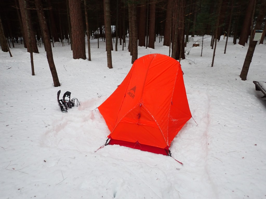 At the campground I met a nice guy around my dad’s age from Vermont named Steve who was staying at a lean-to with his friends. He invited me over to join their campfire later on, which was definitely better than lying down in my tent in the cold and dark! I set up camp, which involved a bit of prep packing down the area my tent would be set up, but was able to get everything set up well before dark. This was a nice change from my previous visit to this site, where I was camping on ice and it was impossible to put my stakes in.