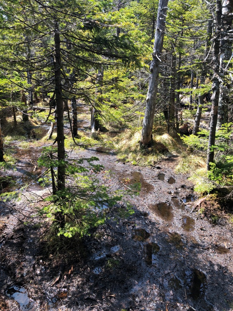 I started my hike at around 6:30am, and quickly found the trailhead to Seward, which, like Seymour’s, was marked by a small cairn that I had overlooked the day before. The trail started off really easy to follow and not too overgrown, but quickly became really challenging as the riverbed became deeper and the trail steeper. It took me a long time to figure out that the idea was to follow the riverbed exactly, so I ended up bushwhacking a little bit trying to avoid the slippery rocks. Eventually, after some cursing and struggling, I figured it out and got past the gnarly sections. Was still a slog up the trail and after about 3.5 hours, it started to level off a bit and before long I was on top of Seward Mountain, ADK peak #28. The peak is the highest point in Franklin County and is also named after a previous (12th) governor of New York, William H. Seward. The trail involved a bit of climbing and the mud and snow weren’t too bad, though a bit worse than Seymour.