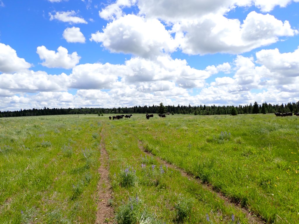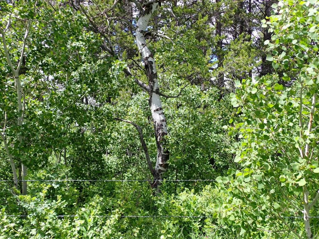 The view point wasn’t super exciting, and I set off along the gravel road westward towards the Cypress Hills high point. I had to walk over a few Texas gates along the way. According to the GPS coordinates, the high point is situated in a birch grove near the end of an overgrown road branching off from the gravel road. I made quick work of the gravel road, and was greeted by a herd of cows as I started up the side road. I took my time to avoid spooking them too much (luckily they were all docile – no bulls!), and eventually left the road and bushwhacked through the field towards the birch grove.