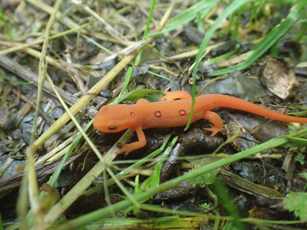 We came across the guys from DC right before we turned back onto the old logging road and helped them find their way to the Huckleberry trail loop. Nearly at the end of the trail, I found a little red-spotted newt on the trail – very neat!