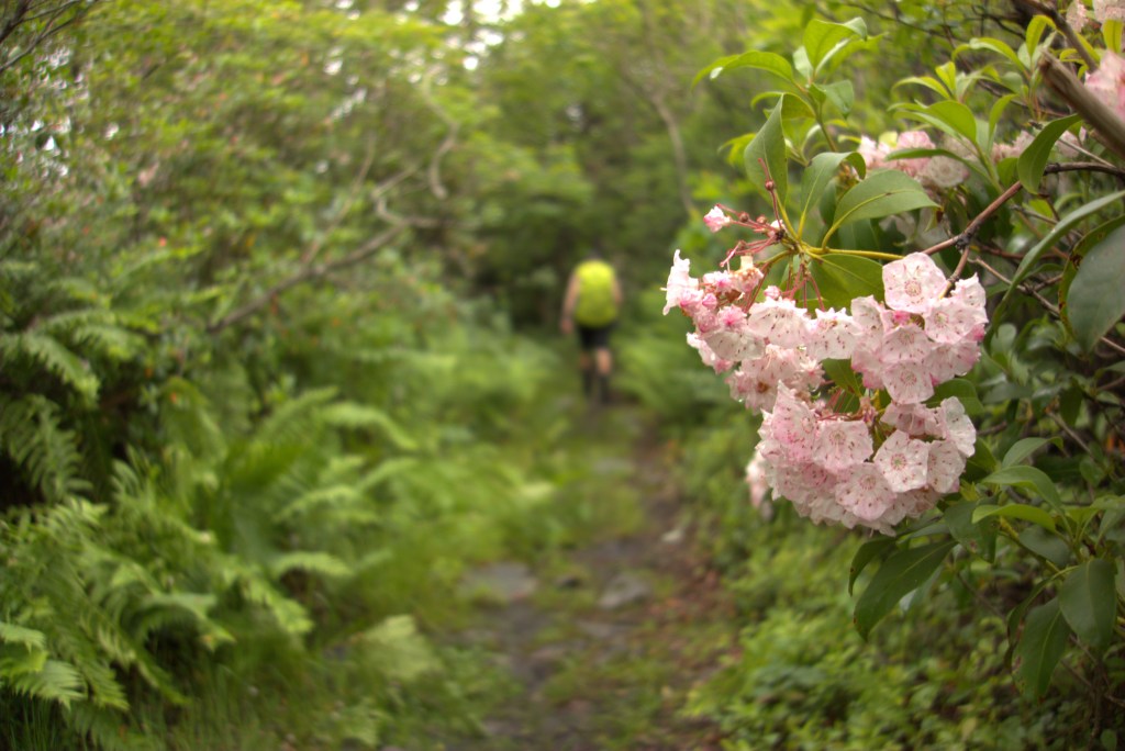 Our planned route to Spruce Knob was an approximately 17km out and back trail starting at a trailhead located off FR 112 (which leads to the parking lot near the summit), and follows an old logging road for a short distance before connecting with the Huckleberry Trail, which spans the entire ridge of Spruce Mountain to the Knob. We parked just after 5pm after less than 2 hours of driving, loaded up our overnight packs, and began hiking at around 5:40pm, with the goal to hike as far as possible until 7pm, and grab one of the many campsites along the trail. Alain had brought along some Leukotape which, based on extensive research, one of the best methods for blister prevention while hiking. I applied a long strip to the back of both of my heels before setting out. The trail started off fairly overgrown along the logging road but was still easy to follow. There was a bit of mud and a river crossing to navigate but not too challenging.