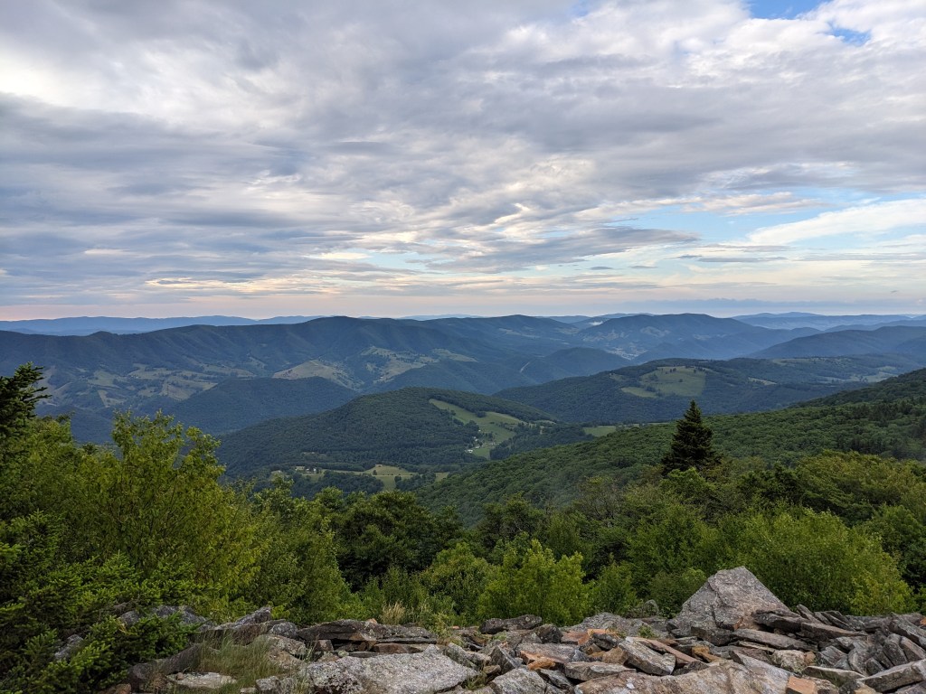 Overnight we were hit with quite a lot of rain, starting at about 10:30pm and going all the way to 4am or so. I guess this was the optimal time since we were in our tents which are (at least in Alain’s case) fully waterproof. My tent is 14 years old so it’s seen better days, and did a fairly decent job, but it was still really sad packing up a soaking wet tent. Our plan was to hike to Spruce Knob, return to our site for breakfast, then pack up and hike down to the car.