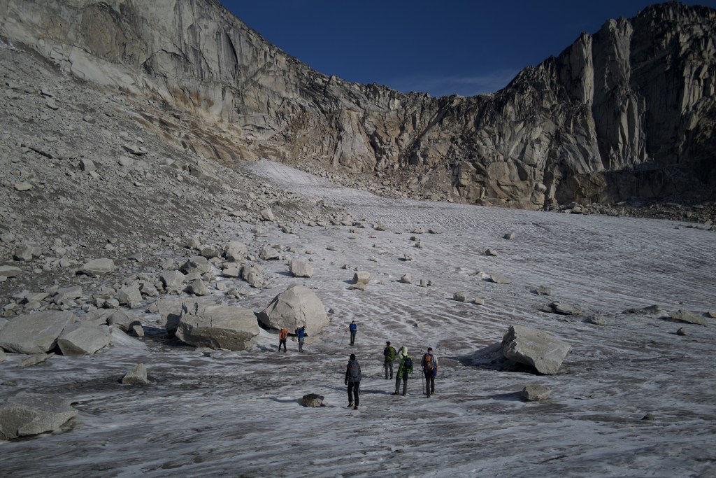 After lunch, we reviewed crevasse rescue in the hut (using very scaled down demos on the table!) and the weather turned around afterwards, so we went back out for a quick 90 min hike up to Applebee campground, one of two tent camping areas in the Bugaboos. This was a pretty sweet little camping area with great views of some of the peaks like Eastpost Spire and Snowpatch Spire. It was interesting learning about the evolution of the area and getting an understanding of how detrimental the retreat of the glaciers has been for alpine rock climbing routes. We even saw a daring pika interested in Karly’s dropped pack.