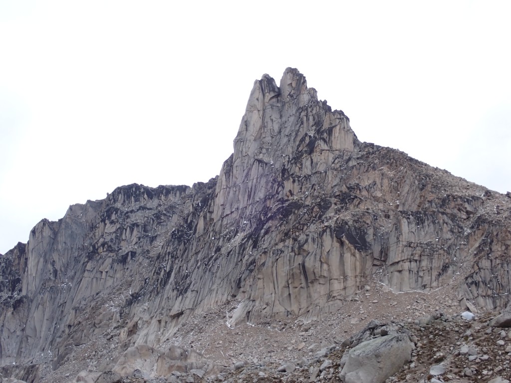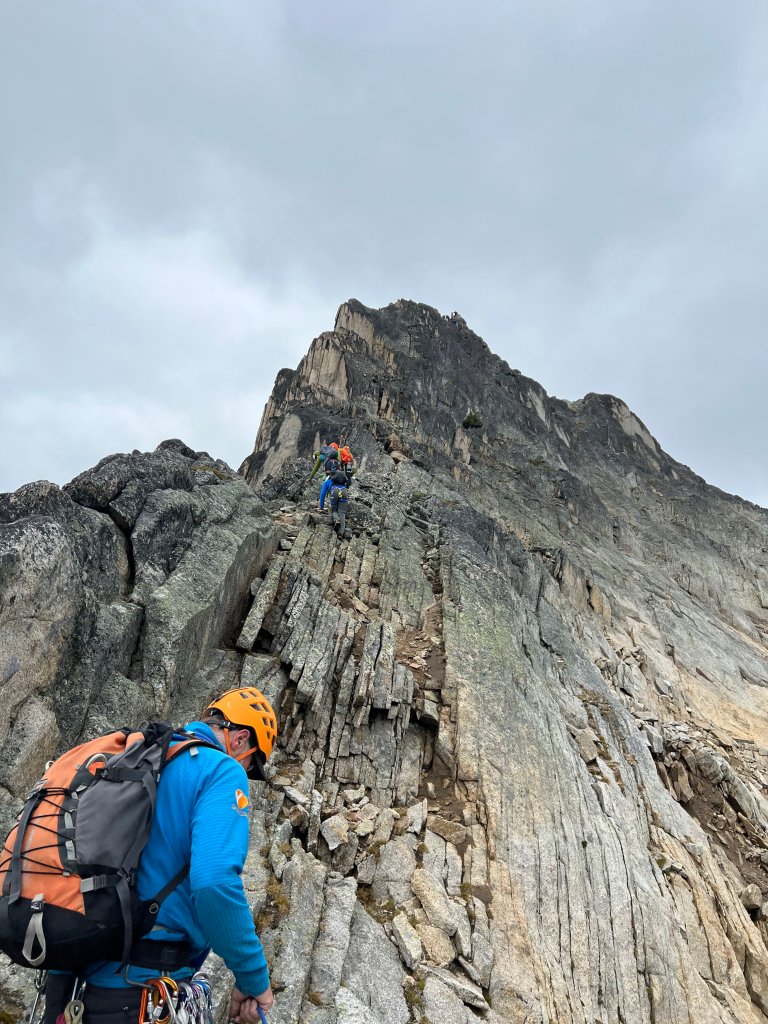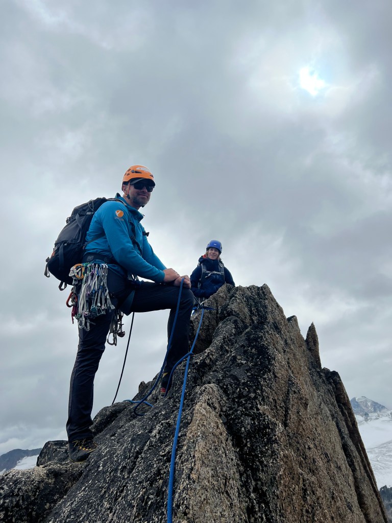 There were three interesting sections of the climb I want to highlight here. The first involved descending a large slab from the first summit. Fairly grippy rock, and it was also quite a quad-burner when we had to go back up on our way back! The second was probably the most exposed part of the climb and involved a bit of “au cheval” movement to traverse a fairly sharp ridge prior to the second false summit. This was definitely super uncomfortable! There was also a bit of technical class 5.4 climbing heading up to the true summit, but compared with the other climbs on this trip, it wasn’t too difficult. Before long, we were at the true summit, which had a rappelling station and a large boulder just above.
