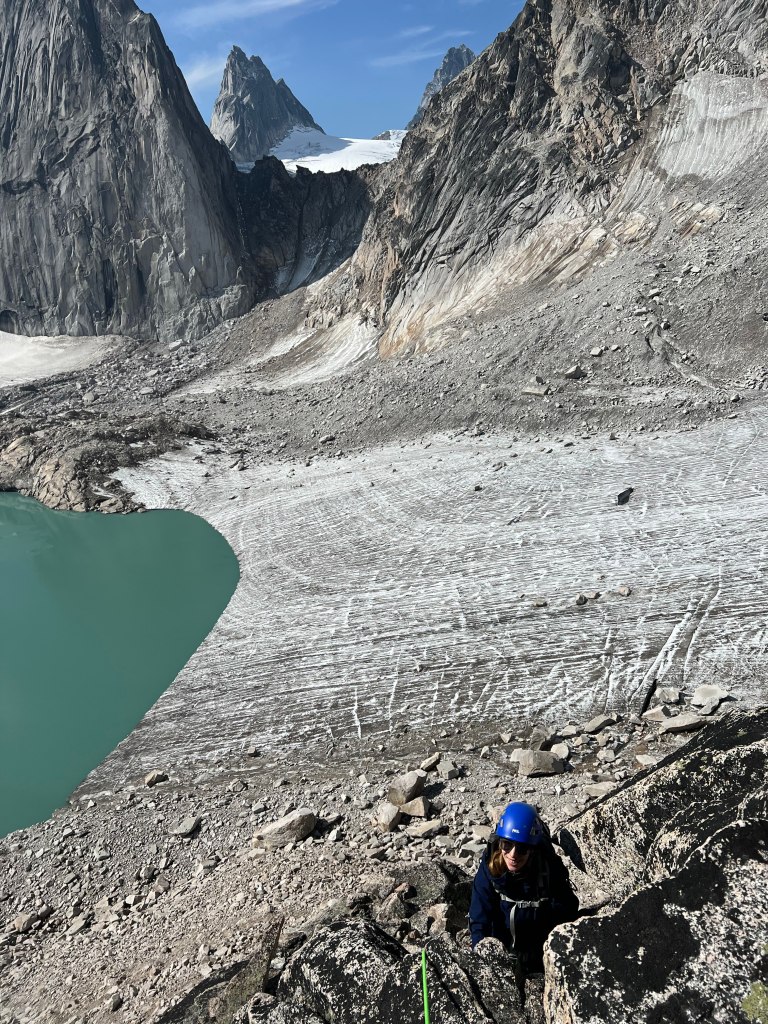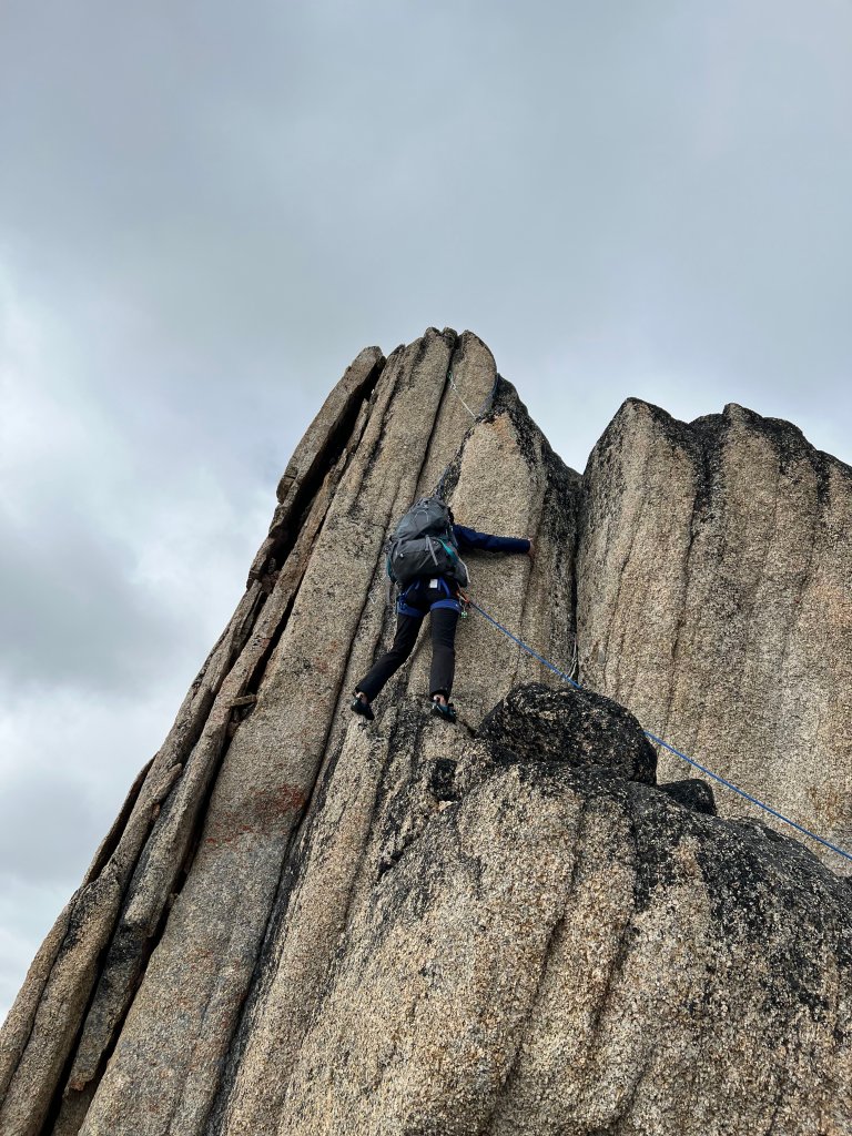 The granite was very grippy and also quite sharp in places, which meant that although I got good purchase with my holds, my hands did take quite a beating over the course of these three days. We did about half the pitches in our boots, which were actually really solid climbing shoes for “easier” terrain, and then switched to climbing shoes for the last few pitches, something that we generally did for all of our climbs on the trip.