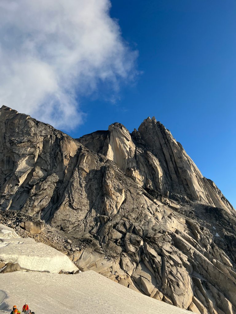 The hike up the glacier was certainly interesting! As we were at the end of the season, there wasn’t too much snow cover left, meaning the crevasses were very easy to see. The problem was that there were so many of them, and they were so wide, we had to take a torturous path in order to skirt around them – they looked incredibly deep. One spot had us crossing a snow bridge close to the side of Pigeon Spire, but it wasn’t too bad and we got to the base of Pigeon in no time. Plenty of great views of the Howser Towers nearby!