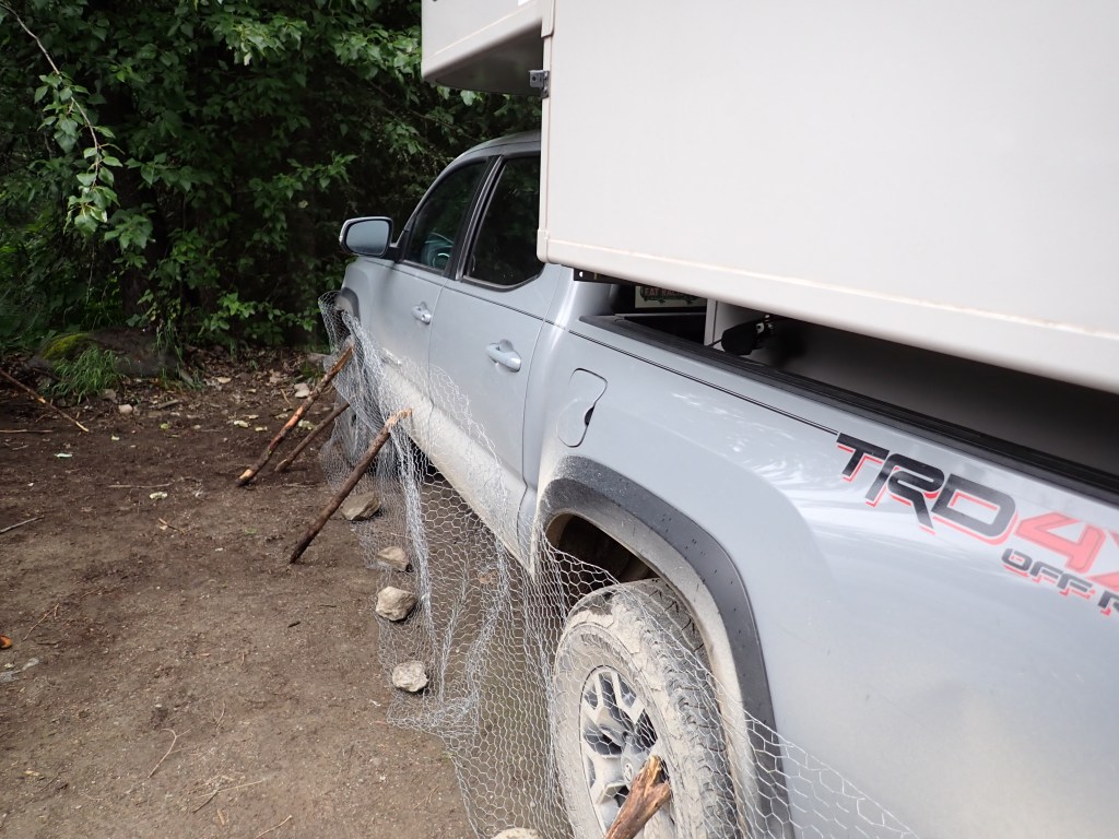 Eventually, we made it to the trailhead, and were greeted by the site of hundreds of meters of chicken wire that had been left behind. It is highly recommended in the Bugaboos to protect your vehicle by wrapping it with chicken wire to keep the critters away from the undercarriage. Apparently the porcupines there love chewing on brake cables! This meant that the guys didn’t need to use the brand new sets of chicken wire they brought along!