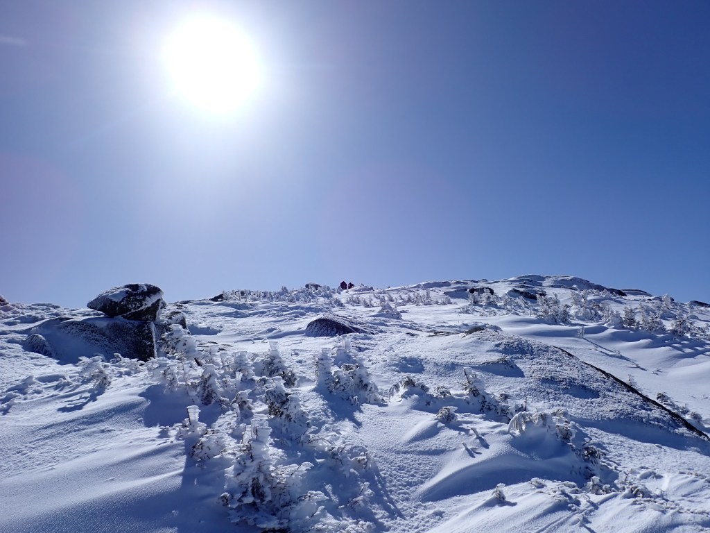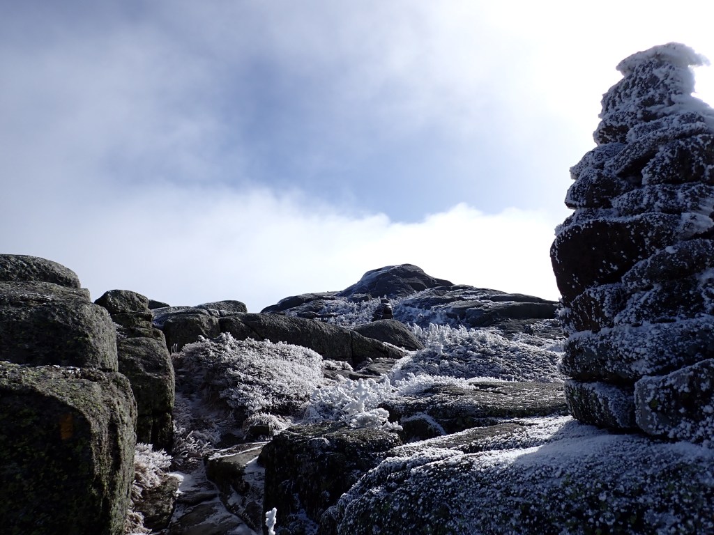 I began the descent down the southwest side of Algonquin on the way to Iroquois, and the wind was ridiculously cold. Not as bad as Washington, but it was enough for me to don my balaclava and ski goggles. The hike down was quick and I briefly entered a small wooded area for some respite from the wind. It was really cool seeing pockets of vegetation at the lower elevations along this ridge. I passed by Boundary Peak, which is a minor peak between Algonquin and Iroquois (too close to either of them to count as its own High Peak), and entered another small wooded area, before starting up the final push to the summit of Iroquois.