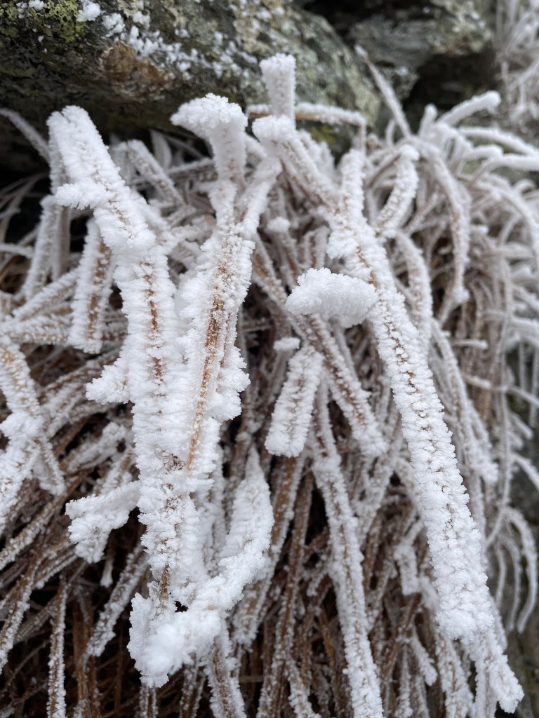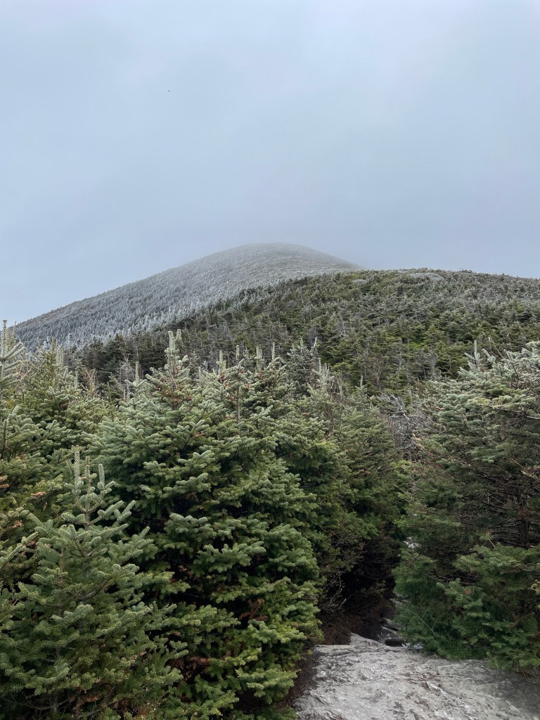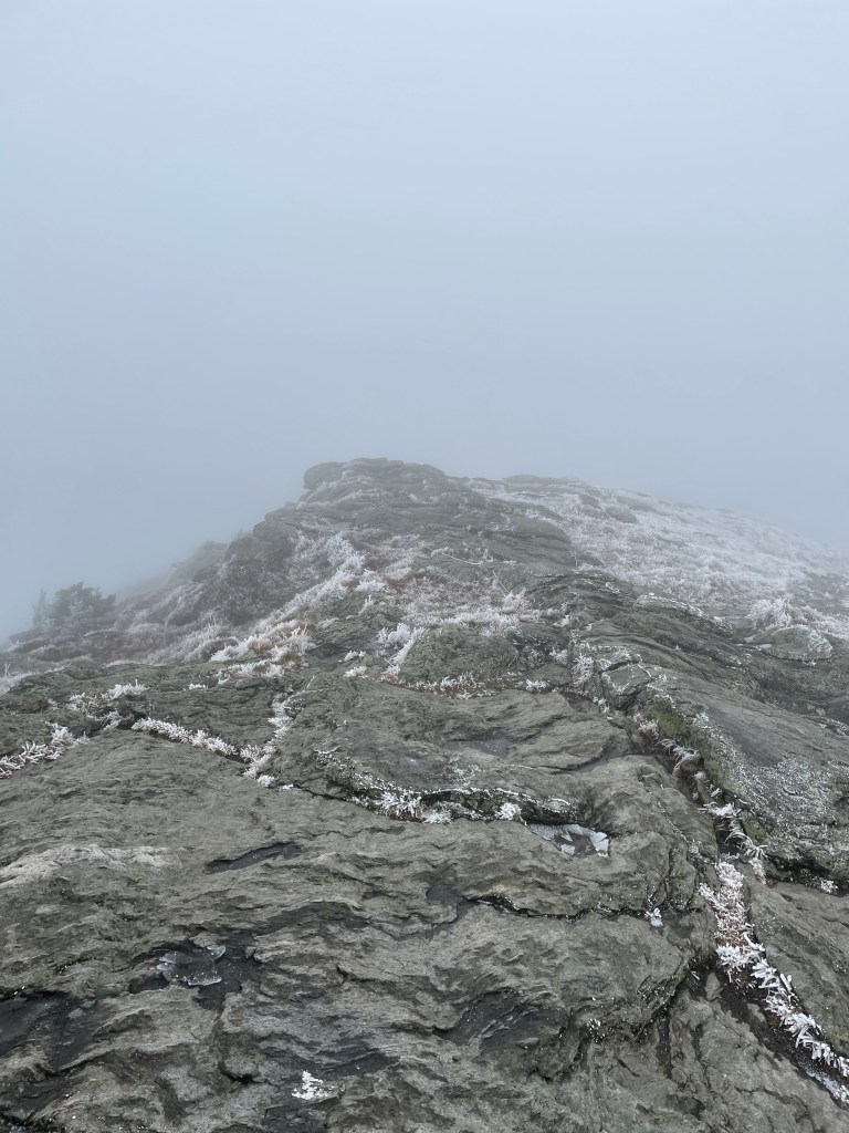 I did get some info from descending hikers that there was some ice in the last 500m or so, but it was fairly easy to navigate it. I realized about halfway through my drive to Vermont that I had left my microspikes at home, though, funny enough, my crampons were in my car, which would have been overkill. As advertised, there was some slick icy sections but it didn’t pose too much of a problem. Once I got above treeline I layered up as it was quite cold – temperature at the summit was forecasted to be about -5C (-15C with wind chill).