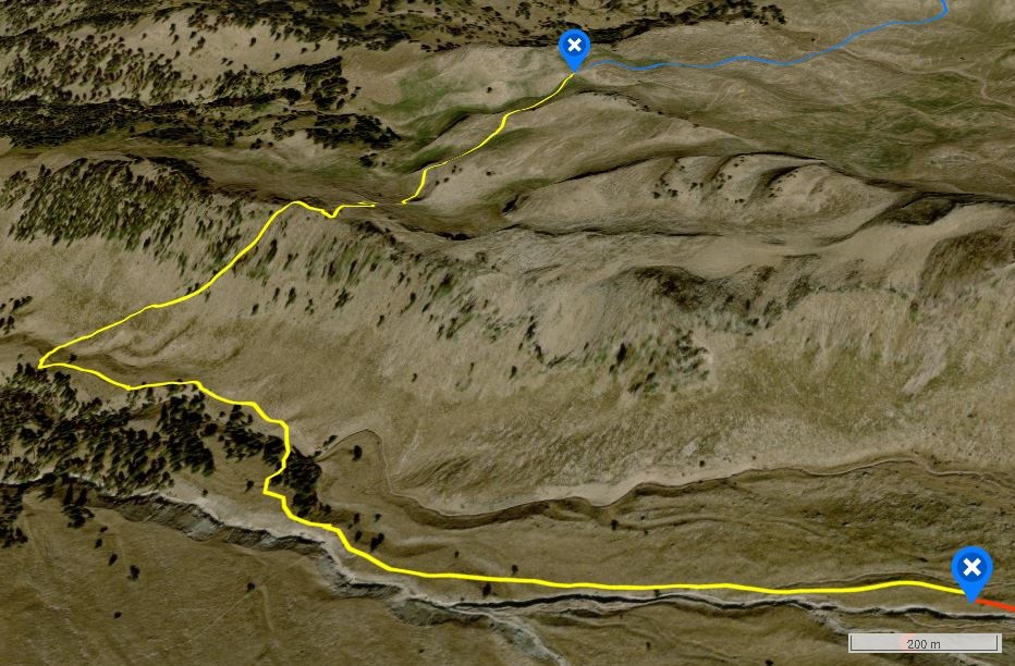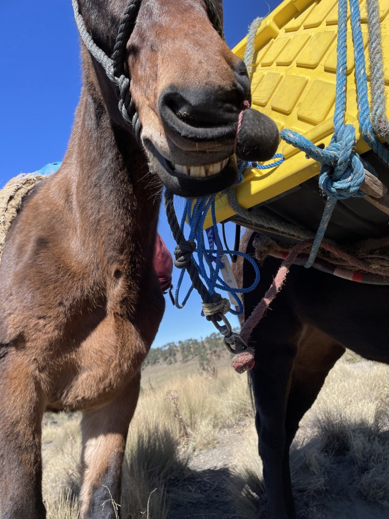 At around 11am, the truck was finally freed. Despite our efforts to cover up the barb wire fence, the guy driving the truck completely ignored these efforts and recklessly drove over an uncovered section of the fence, much to our mix of amusement and horror. We relaxed at camp for a couple of hours while the Mexicans escorted the truck back to the main road. Frederick started hiking out towards the ridge ahead to scope out the terrain on the other side for areas to place our base camp. At around 1:30pm, the horses returned and they began loading up our gear and supplies. Shortly after that, we set out – Luca joined the convoy to take the longer route around the ridge, while I followed Frederick’s path. The hike up was pretty fun – I was able to follow Frederick’s footsteps in places and clamber up to the top of the ridge. The way down to the valley on the other side seemed a bit spooky, and it took me a while to get down, with a lot of loose rock and small cliffs (this was definitely way beyond hiking at this point). One section had me lowering myself about seven feet, and I was very relieved when the terrain started to level out.