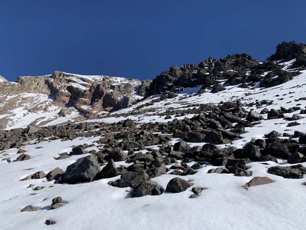 Our goals for the day were to hike up and find a route through the lower parts of the mountain, find a spot for a high camp (from which we would make our summit attempt), and ideally get to an area with sufficient snow to practice self-arresting. This trip was technically a course as well as an expedition, so Frederick wanted to make sure Luca and I were up to speed on the technical aspects of the climb. I definitely wanted to get some more practice self-arresting, having last done some reps at the ACC mountaineering camp in July.