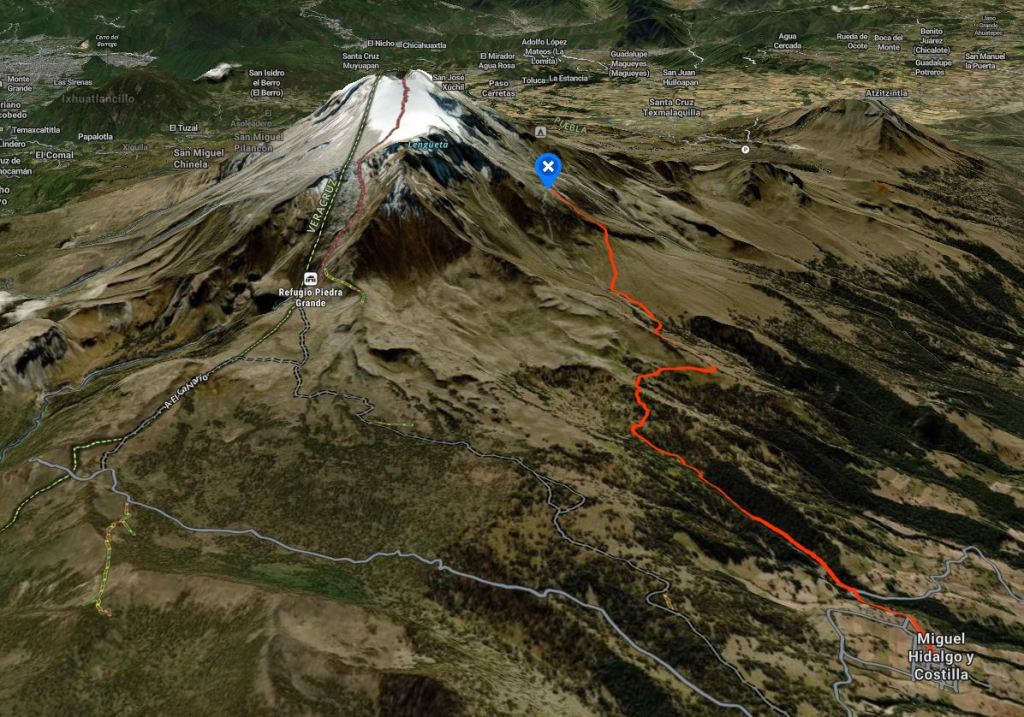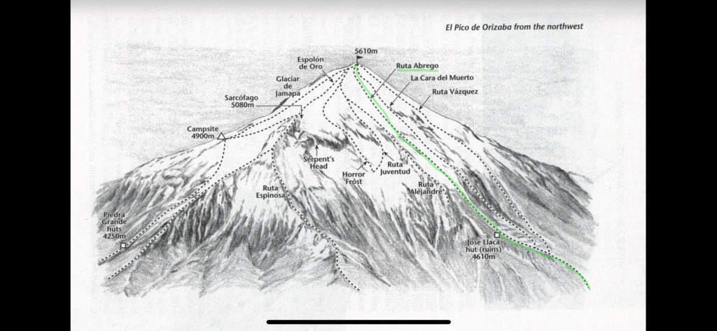 For this expedition, I would be joined by Luca, who I had met way back at the Intro to Mountaineering course with Yamnuska in summer 2022. Our plan for the trip was primarily to summit Pico de Orizaba, via an alternative, not commonly climbed route “La Ruta Abrego” on the west side of the mountain. We would likely be the only people on that part of the peak during our ascent. Orizaba is most commonly climbed from the north via the Refugio Piedra Grande (a classic glacier ascent via the Jamapa Glacier) or the south (Ruta Sur) from the Refugio Fausto Gonzales. The southern route, due to its aspect, is steeper, has no glaciers and has very little snow, making it a slightly more challenging rock/scree ascent. Frederick had only done the standard glacier route in the past, however one of his colleagues noted a large amount of snow on the Ruta Abrego a couple years prior, piquing his interest.