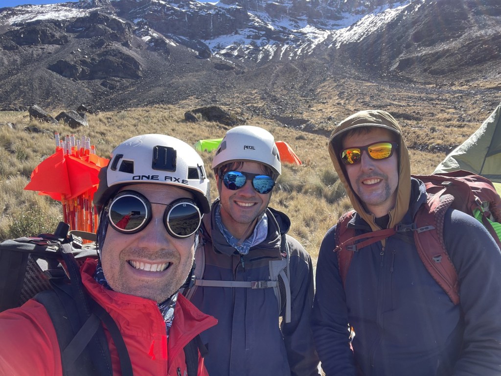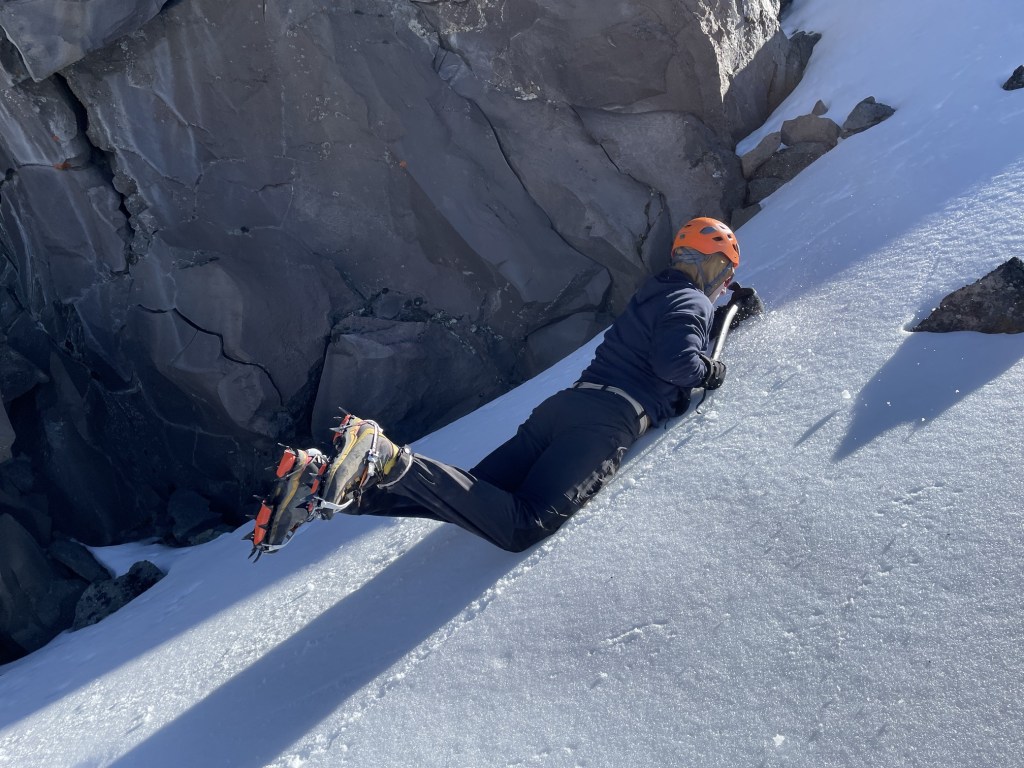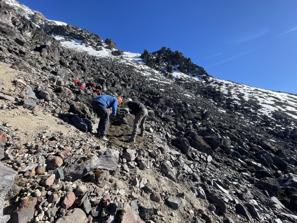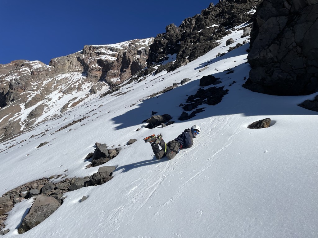 At about 4500 meters, Luca cut his shin, so Frederick had to do a bit of first aid. We observed a number of cairns a bit higher up – likely from previous ascents of the mountain, though based on the terrain, this area had likely not been visited in some time. We found two spots that looked like campsites – the first was more of a bivouac location (able to only accommodate a bivy sack), the second, at about 4630m, looked big enough to set up a tent. We placed a wand at this spot so we could find it later. About 100 meters higher than the potential campsite, the snow field began and we donned our crampons and ice axes to practice self-arrest. We got about 45 minutes in before beginning to descend at 3:45pm. We stopped by the marked potential campsite and dropped off the technical gear in our packs – ropes, crampons, gear, and hard shell jackets. The plan would be to return the next afternoon to set up our high camp at this spot.