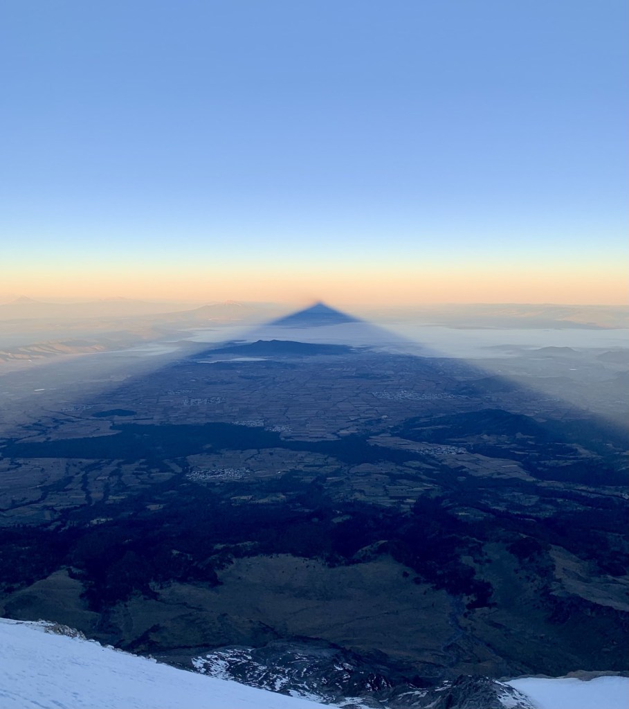 Thankfully, there was a solid set of switchbacks up the Jamapa Glacier to follow (we could see these from Hidalgo), so travel, while slow, wasn’t terribly complicated. It was definitely a long slog, with one step at a time being the focus. I could definitely feel the added difficulty of taking each step due to the terrain, thin air, and fatigue, but I felt pretty good otherwise, no symptoms of altitude sickness as we went above 5000m. The sun finally began to rise around 7am, and it was truly a marvellous view. We stopped briefly to take pictures of the shadow of Orizaba cast into the valley below.