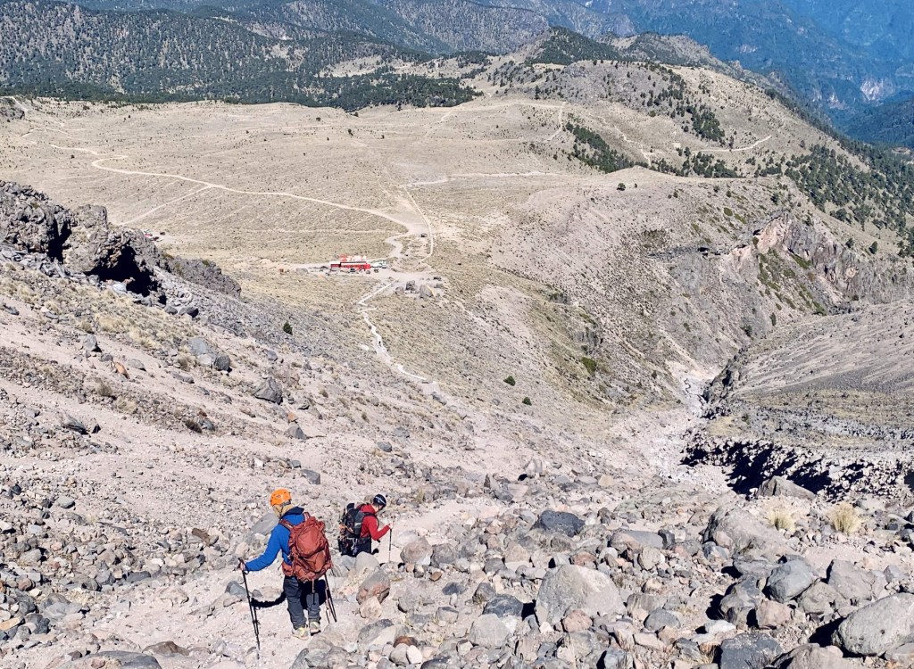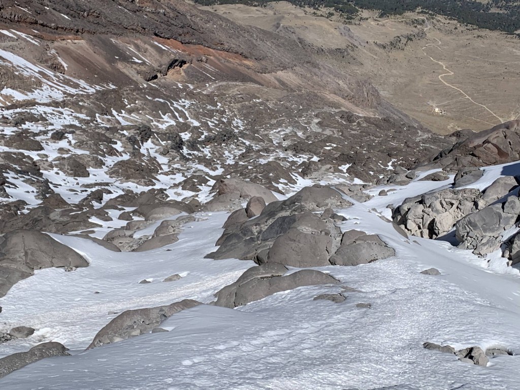 It took Frederick some time to find his way back (our voices echoing made it a bit confusing) but when he did return he indicated that things did not look any better on the slopes above. We traversed a short way over to the north and observed a mostly loose rock slope, with a small amount of snow, and overall, it was VERY steep. A bit further away, rocks were tumbling from the slopes above, and it was only 7am (generally, conditions become a bit more dangerous as it warms during the day – it was alarmingly early to see rockfall). Frederick indicated that given the risk level, we would be aborting our attempt, and we would aim for an ascent of Orizaba via the standard route in the next few days. The route was definitely climbable, but if it was climbed, being unroped or ascending fixed ropes would probably have been the correct course of action (as self-arrest would be nearly impossible, if one of us took a fall we would all likely go down with him). It was a bit disappointing but completely understandable. We then began our descent, which was a bit easier than the climb, but still required a lot of focus to get good purchase with every step.