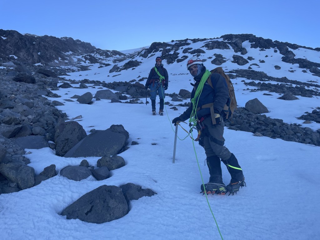 The summit was uncharacteristically windy and cold. Frederick mentioned it was the worst he had ever experienced in all of his summits – on his previous climbs you apparently could unrope, sit down and enjoy your lunch on the summit! So, we didn’t spend too long here, just enough time to take some photos then we immediately began our descent. It was overall a bit easier than the climb up, though I did need to take a short breather on one particularly long switchback (in which my left quad got super fatigued). Sarcófago looked so tiny from above, despite towering above as we traversed the lower glacier.
