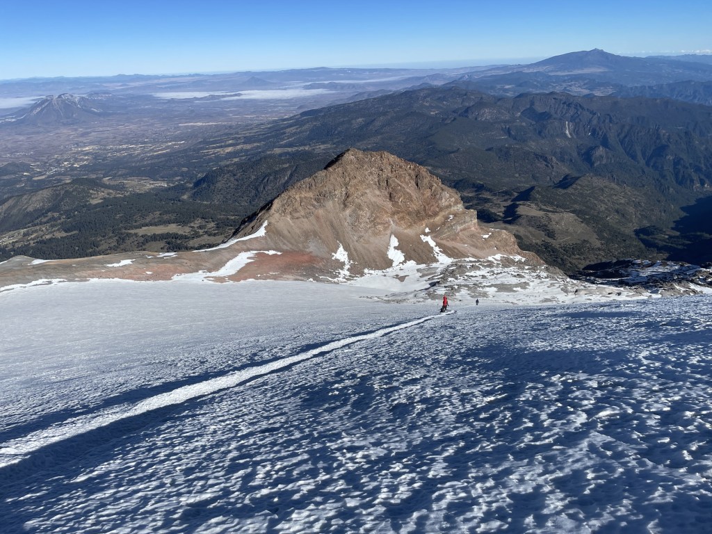 We were moving pretty slowly to be safe, and another pair of roped climbers decided to hustle past us by jumping off the switchbacks briefly. I had a funny feeling when I saw them begin to overtake me, and all of a sudden, one of the crampons of the trailing climber popped right off his heel. I yelled out “CRAMPON LOOSE!” which startled Luca, but fortunately the climbers were able to stop and address the issue. It looked like that climber did not have the best compatibility between his boots and crampons, which just seems crazy to me that you wouldn’t have your gear dialed in on dangerous terrain (even though Orizaba is considered an easier snow/ice climb, people have fallen and died on the Jamapa glacier in the past).