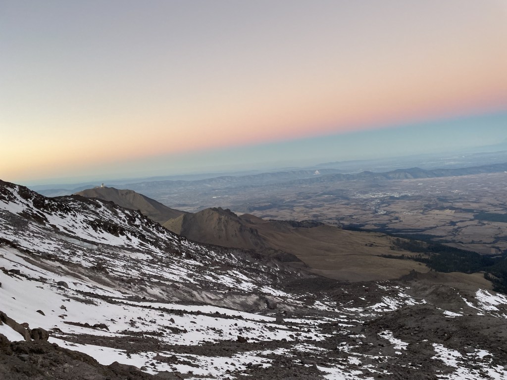 It was pretty slow going overall. After one extremely steep slope (which Frederick and Luca climbed “ice climbing” style as it was about 70 degrees – I just side stepped it and stayed upright), we stopped on a rocky ledge while Frederick went ahead alone to scout the next part of the route. We were at about 4900 meters, still about 700 vertical meters from the summit, and we had been climbing for about four hours. The sun was starting to come up, providing us with great views of the area west of the mountain as well as neighbouring Sierra Negra (4566 meters).