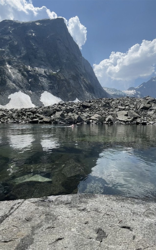 On the first full day at camp, prior to departing for the day’s trip, I ran back to my tent to pick up something I forgot, and rolled my left ankle on a root/rock. The pain was sharp and I immediately knew it was significant. While I was able to do that day’s excursion (snow skills), my ankle swelled up quite a bit due to the sprain and that pretty much ended camp for me. I stuck around camp the whole week which gave me huge FOMO, though I was able to enjoy swimming in the nearby tarn.