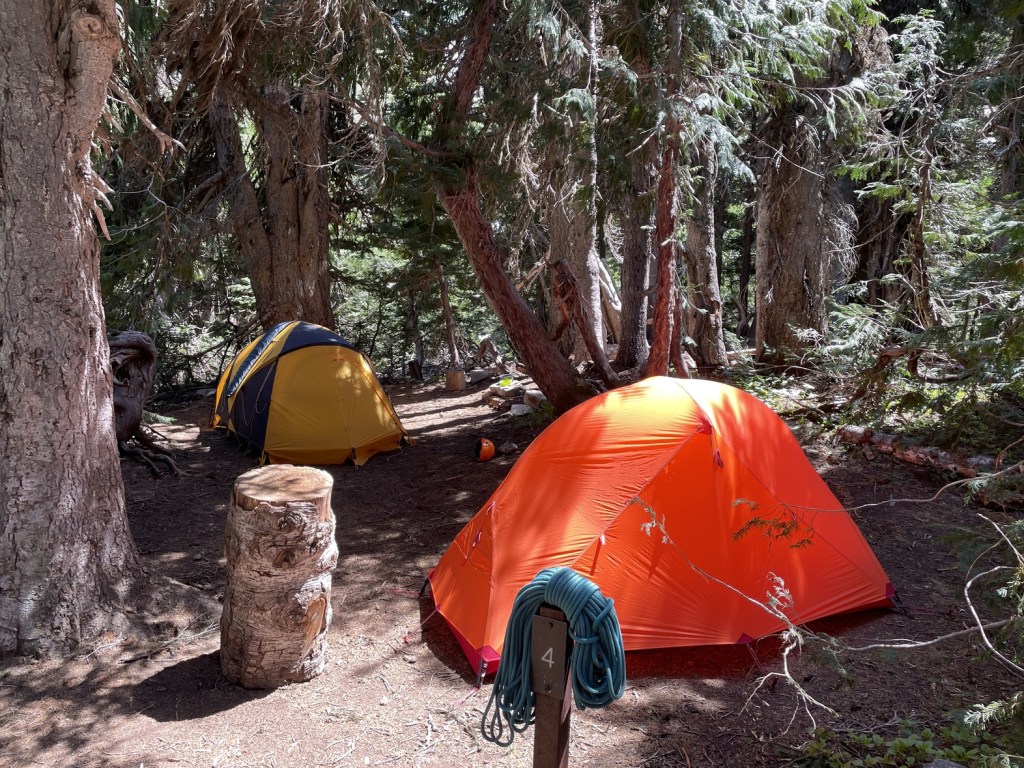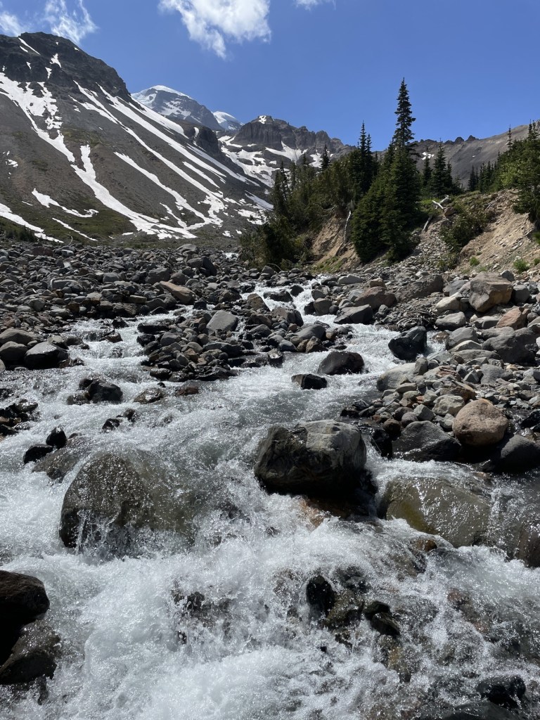 We arrived at Glacier Basin very early, around lunchtime, so we had lots of options for sites to choose from and time to settle in. We picked a site that was shaded all day – no sense in baking in the sun at this point when we would be getting tons of sun exposure later in the expedition. After setting up and exploring the area, including the food storage bin (there was a bear sow and cub in the area) and the privy, we made our way down to the stream to cool off and collect water.