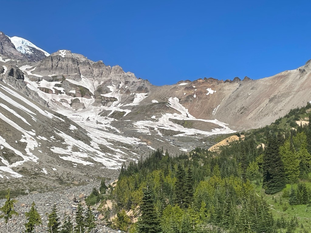 We finally were able to grab fresh flowing water, and walked down the last bit of the glacier via plunge stepping, passing by our previous campsite and retracing our steps back to Glacier Basin. My legs felt surprisingly good at this point, though I was careful to watch my footing as there were some steeper dirt sections as well as rocks to avoid. After filling water at Glacier Basin, we took a short rest where I taped my other big toe which was acting up (this seems to only happen in my Nepal Evo boots on descents) and Bryan called the car rental place. Sadly, they charged us a full extra day even though we planned to return the car only 8-9 hours later than originally planned. As it turned out, 8-9 hours was way too conservative of an estimate, more on that soon..