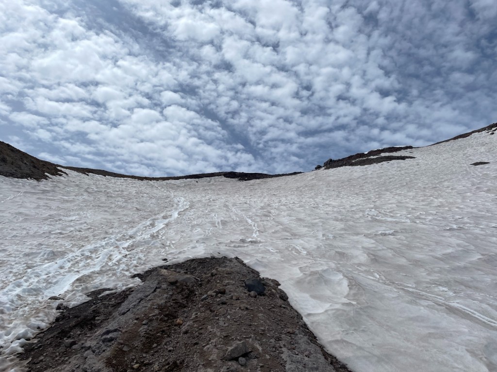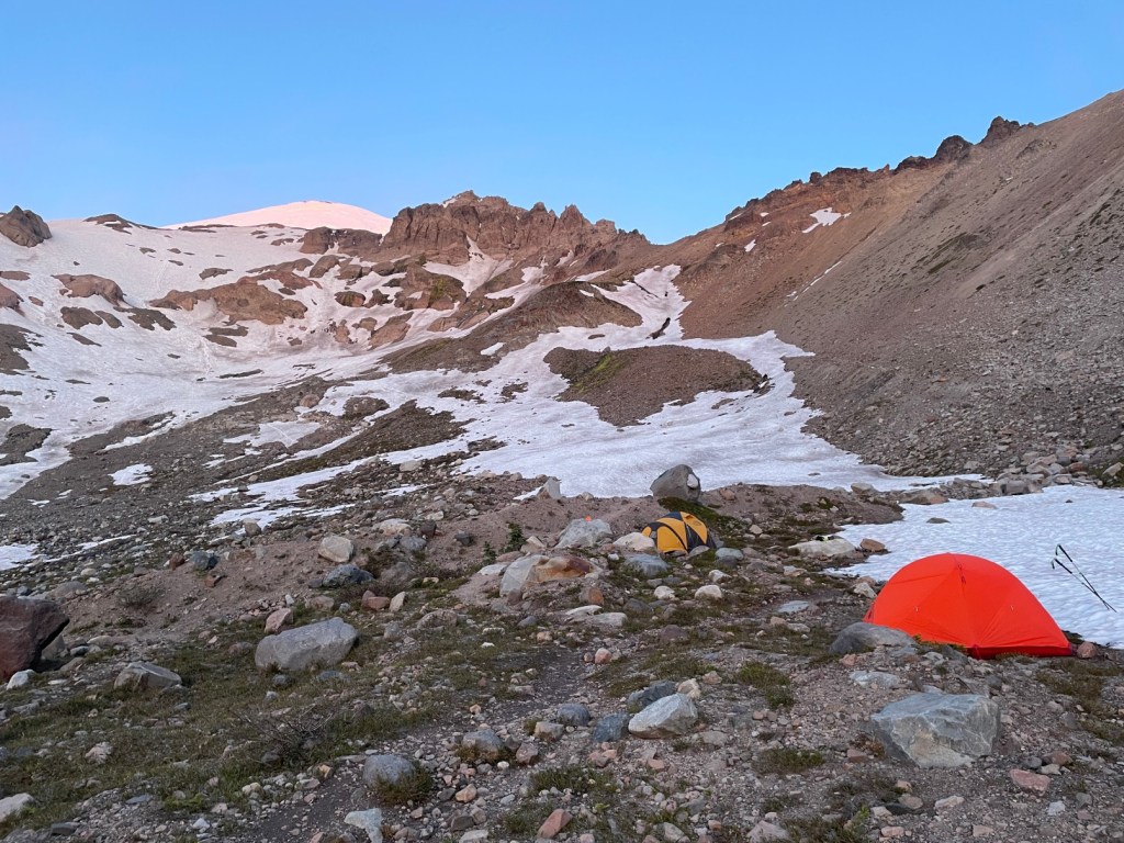The descent was faster than the climb up, bit still very slow and laborious owing to fatigue and snow instability. Every step had to be taken with care and there was a lot of slippage in the snow. My knees started to act up partway down and we took extra special care as the descent is usually where accidents and injuries happen. After what felt like forever, we finally reached the final snowfield down to camp, and took a solid break. This final descent was brutal – I tweaked my ankle and tripped over my crampons a couple times (probably should have removed them) and the snow was in terrible condition. Unfortunately we could not glissade this section, as there was still potential for crevasse danger.