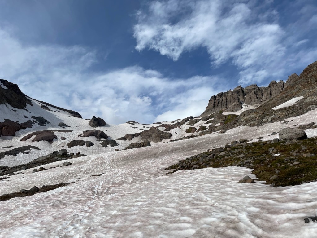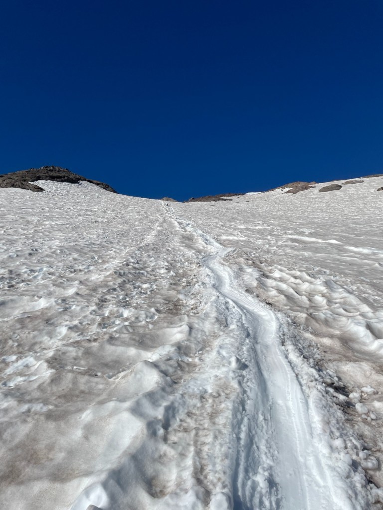 It started off with a pretty mellow grade before getting a fair amount steeper. Not nearly as steep as the snow slope I climbed on Mount Whitney. Mehmet and I took turns kicking steps to follow (making short switchbacks) while Bryan lagged behind, struggling to hold everything in on top of carrying a heavy pack. Mehmet and I had taken on some of Bryan’s load for this part of the climb to make his life easier but it was clear that our progress would be slower than planned. There were a few water sources along the way and we saw a couple climbers glissading down the Inter Glacier – something to look forward to on the way back down!