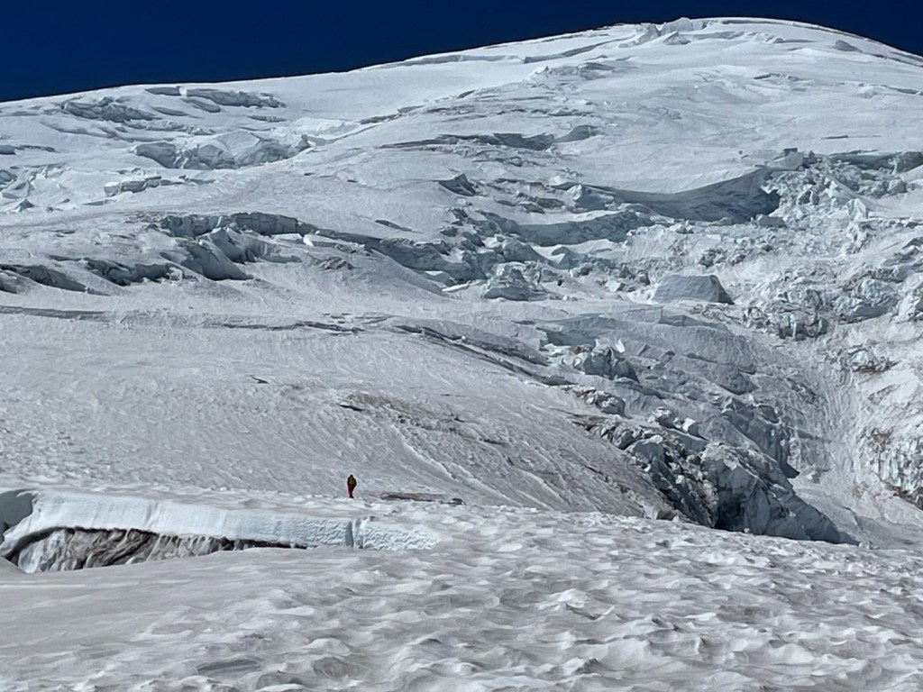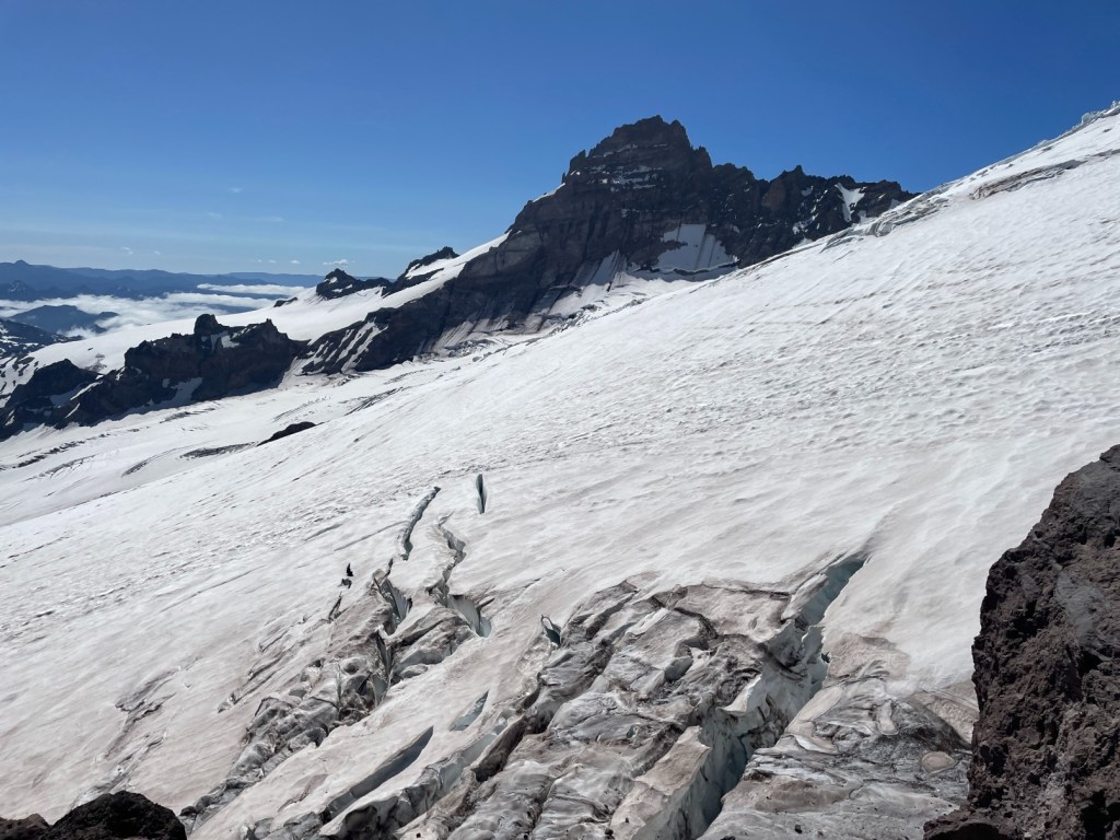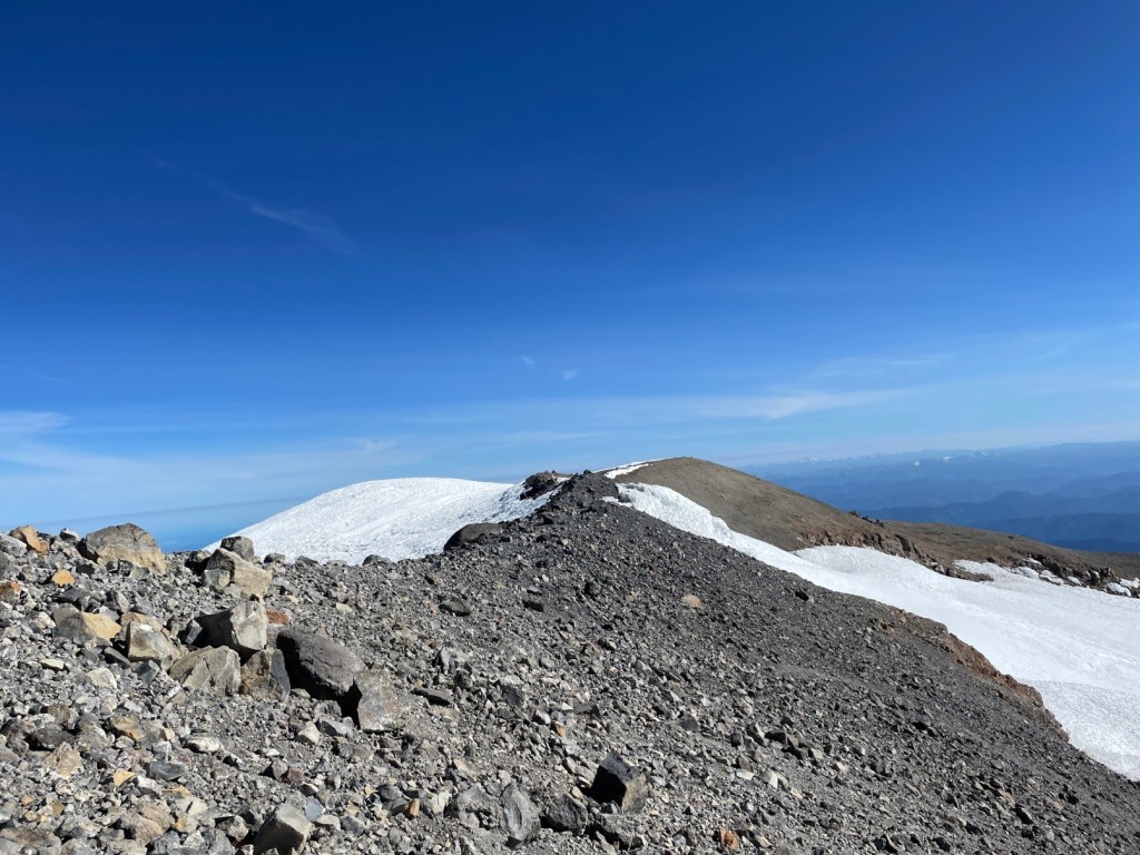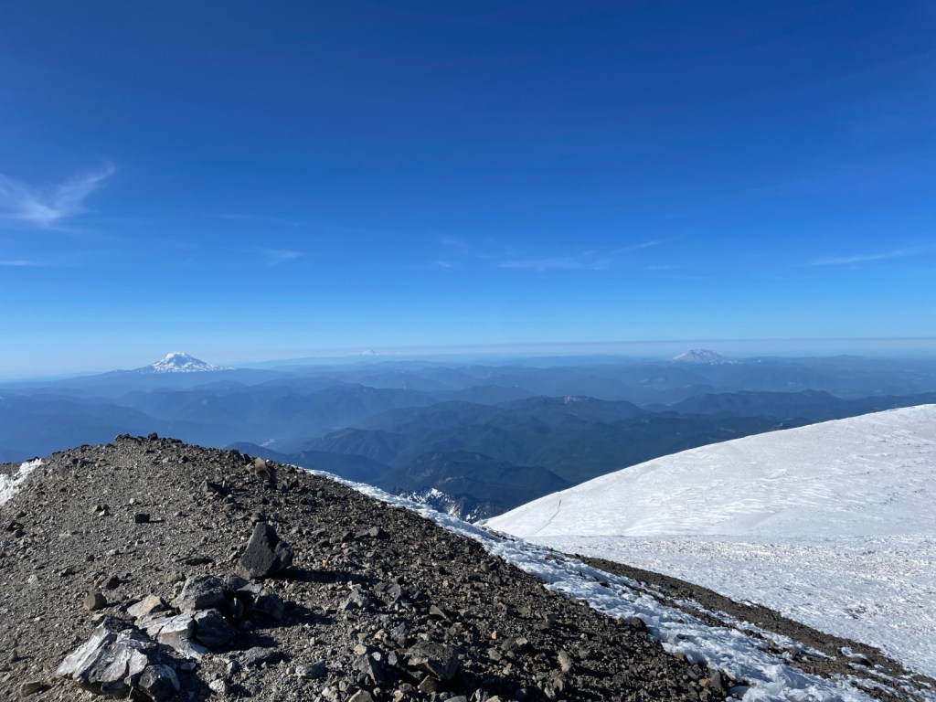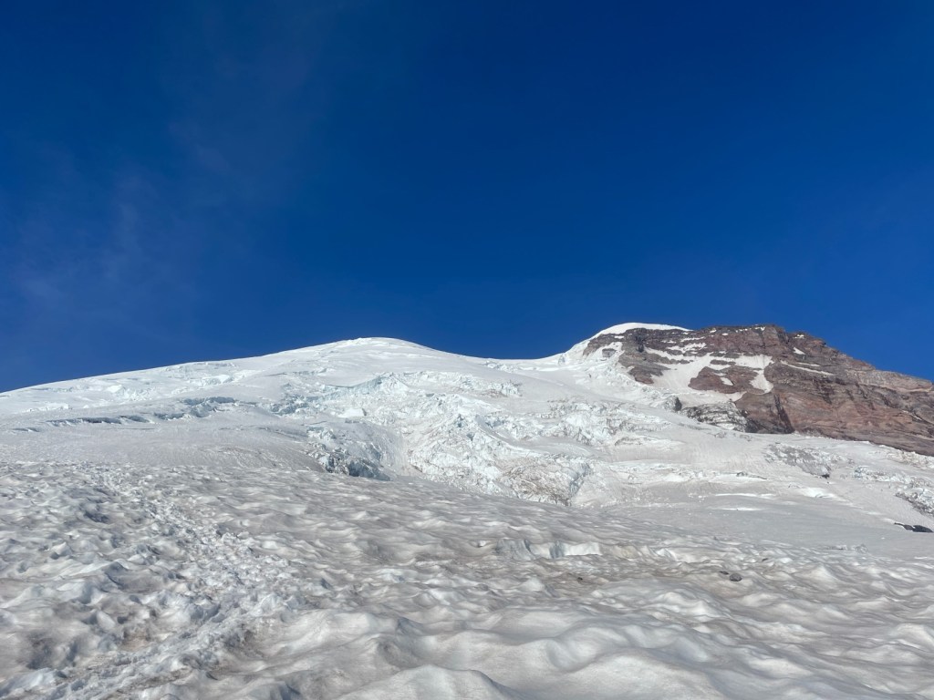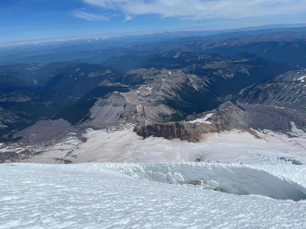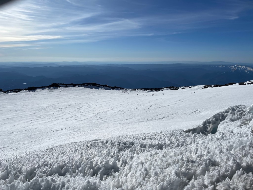 Amazing views at the summit! To the south, we could see Mount Adams, Mount St. Helens, as well as Mount Hood (I initially thought it was Mount Jefferson, but that’s too far south) way in the distance, along with Mount Baker to the north. The crater was spectacular and there were climbers making their way across having climbed the Disappointment Cleaver route. The new summit actually makes the DC route a bit shorter and the Emmons route a bit longer, but not by much. I later learned that there are ice caves and tunnels (carved out by the geothermal heat) and an alpine lake under the snow and ice in the craters on Rainier, which was super interesting to read about.